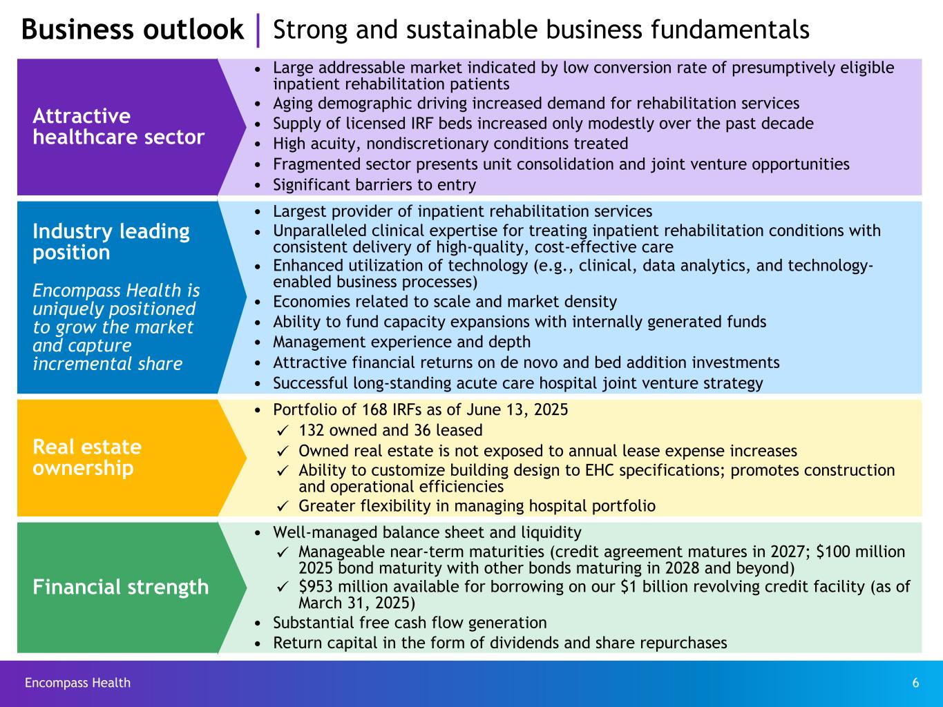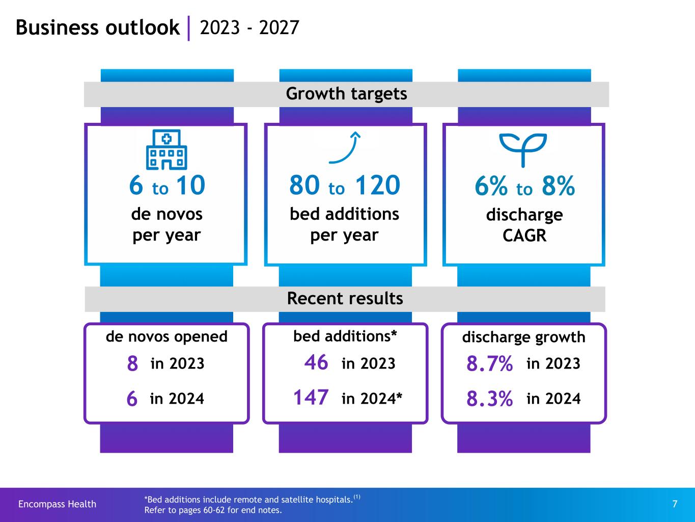 Encompass Health 6 Attractive healthcare sector Ÿ Large addressable market indicated by low conversion rate of presumptively eligible inpatient rehabilitation patients Ÿ Aging demographic driving increased demand for rehabilitation services Ÿ Supply of licensed IRF beds increased only modestly over the past decade Ÿ High acuity, nondiscretionary conditions treated Ÿ Fragmented sector presents unit consolidation and joint venture opportunities Ÿ Significant barriers to entry Industry leading position Encompass Health is uniquely positioned to grow the market and capture incremental share Ÿ Largest provider of inpatient rehabilitation services Ÿ Unparalleled clinical expertise for treating inpatient rehabilitation conditions with consistent delivery of high-quality, cost-effective care Ÿ Enhanced utilization of technology (e.g., clinical, data analytics, and technology- enabled business processes) Ÿ Economies related to scale and market density Ÿ Ability to fund capacity expansions with internally generated funds Ÿ Management experience and depth Ÿ Attractive financial returns on de novo and bed addition investments Ÿ Successful long-standing acute care hospital joint venture strategy Real estate ownership Ÿ Portfolio of 168 IRFs as of June 13, 2025 ü 132 owned and 36 leased ü Owned real estate is not exposed to annual lease expense increases ü Ability to customize building design to EHC specifications; promotes construction and operational efficiencies ü Greater flexibility in managing hospital portfolio Financial strength Ÿ Well-managed balance sheet and liquidity ü Manageable near-term maturities (credit agreement matures in 2027; $100 million 2025 bond maturity with other bonds maturing in 2028 and beyond) ü $953 million available for borrowing on our $1 billion revolving credit facility (as of March 31, 2025) Ÿ Substantial free cash flow generation Ÿ Return capital in the form of dividends and share repurchases Business outlook Strong and sustainable business fundamentals