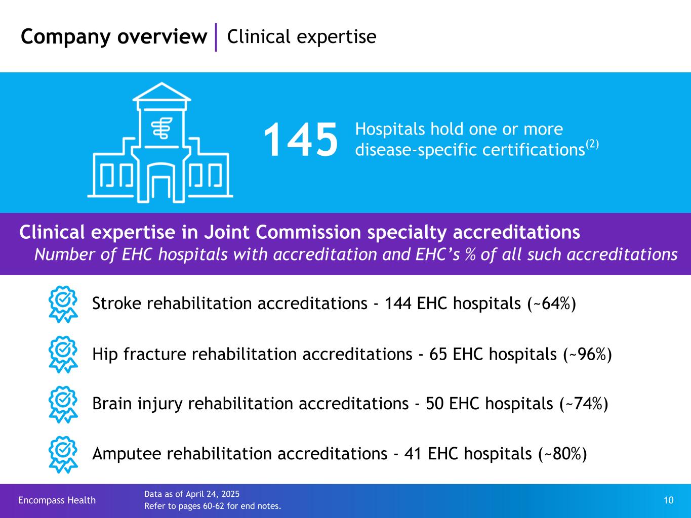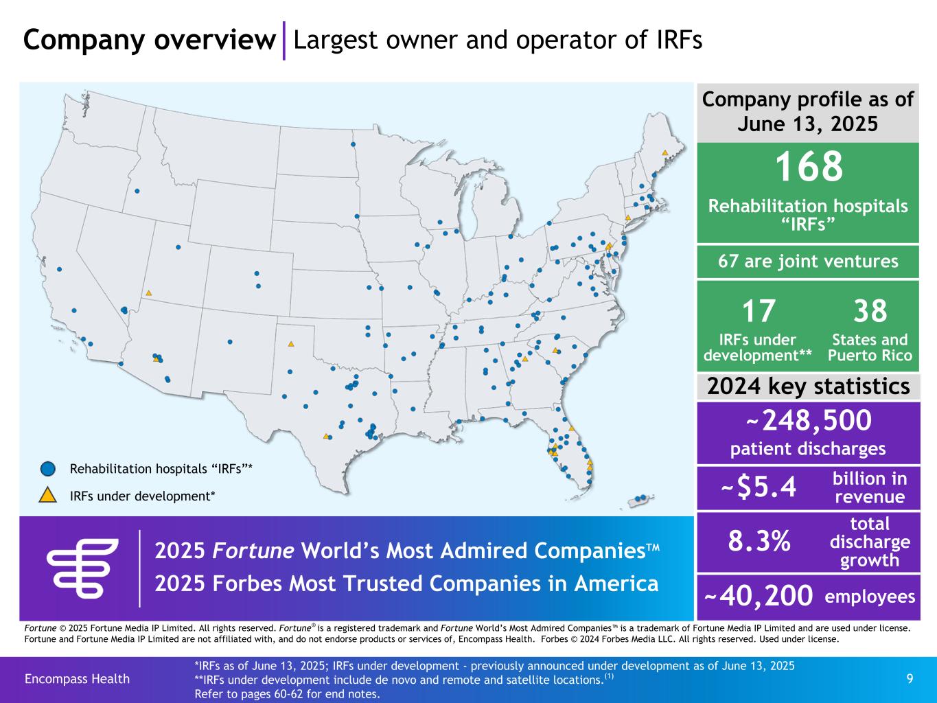 Encompass Health 9 Rehabilitation hospitals “IRFs”* IRFs under development* *IRFs as of June 13, 2025; IRFs under development - previously announced under development as of June 13, 2025 **IRFs under development include de novo and remote and satellite locations.(1) Refer to pages 60-62 for end notes. Company overview Largest owner and operator of IRFs 2024 key statistics ~248,500 patient discharges ~$5.4 billion in revenue 8.3% total discharge growth ~40,200 employees Company profile as of June 13, 2025 168 Rehabilitation hospitals “IRFs” 67 are joint ventures 17 38 IRFs under development** States and Puerto Rico 2025 Fortune World’s Most Admired CompaniesTM 2025 Forbes Most Trusted Companies in America Fortune © 2025 Fortune Media IP Limited. All rights reserved. Fortune® is a registered trademark and Fortune World’s Most Admired Companies™ is a trademark of Fortune Media IP Limited and are used under license. Fortune and Fortune Media IP Limited are not affiliated with, and do not endorse products or services of, Encompass Health. Forbes © 2024 Forbes Media LLC. All rights reserved. Used under license.
