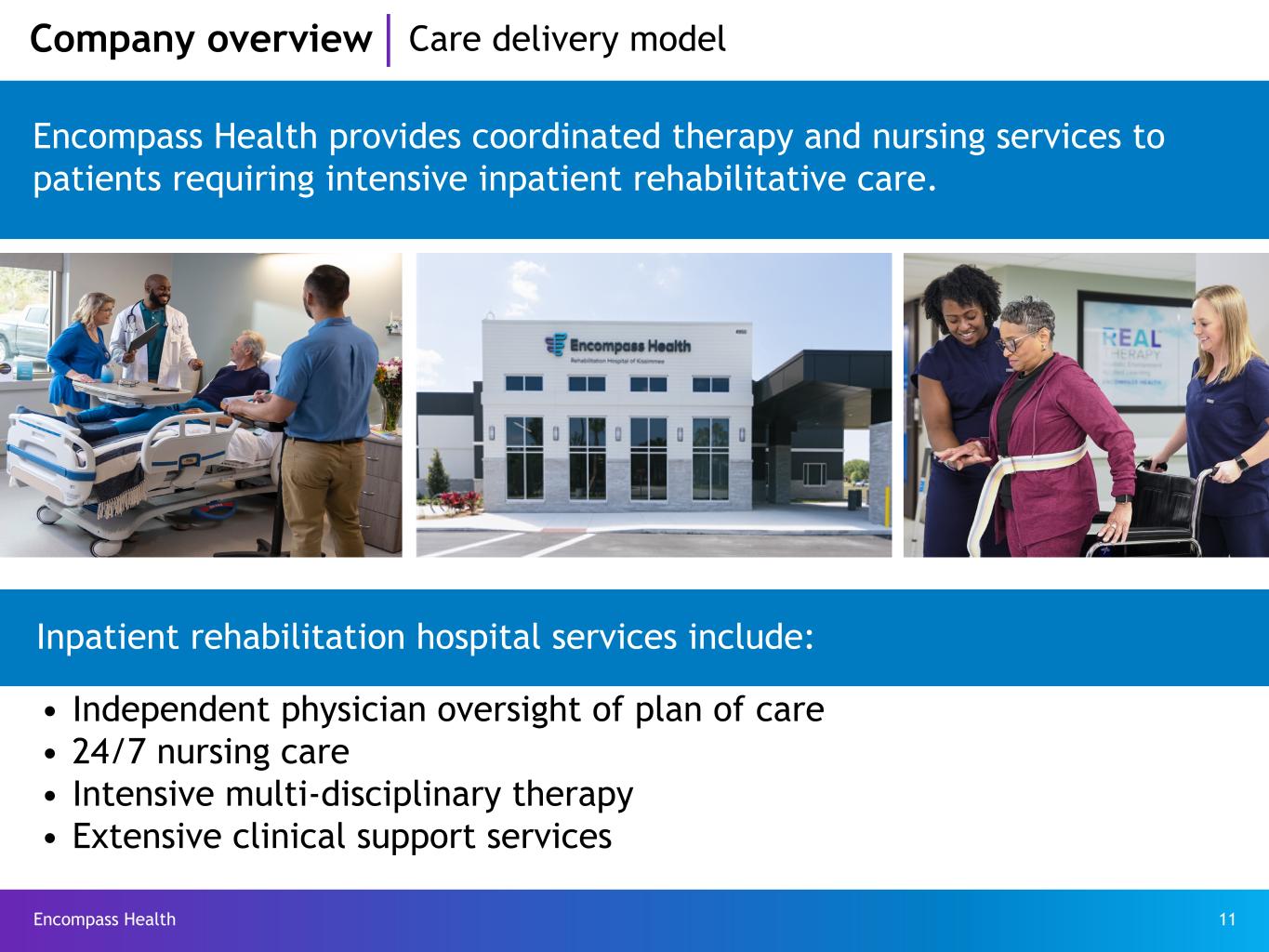 Encompass Health 10 Company overview Clinical expertise Refer to pages 60-62 for end notes. Data as of April 24, 2025 145 Hospitals hold one or more disease-specific certifications(2) Clinical expertise in Joint Commission specialty accreditations Number of EHC hospitals with accreditation and EHC’s % of all such accreditations Stroke rehabilitation accreditations - 144 EHC hospitals (~64%) Hip fracture rehabilitation accreditations - 65 EHC hospitals (~96%) Brain injury rehabilitation accreditations - 50 EHC hospitals (~74%) Amputee rehabilitation accreditations - 41 EHC hospitals (~80%)