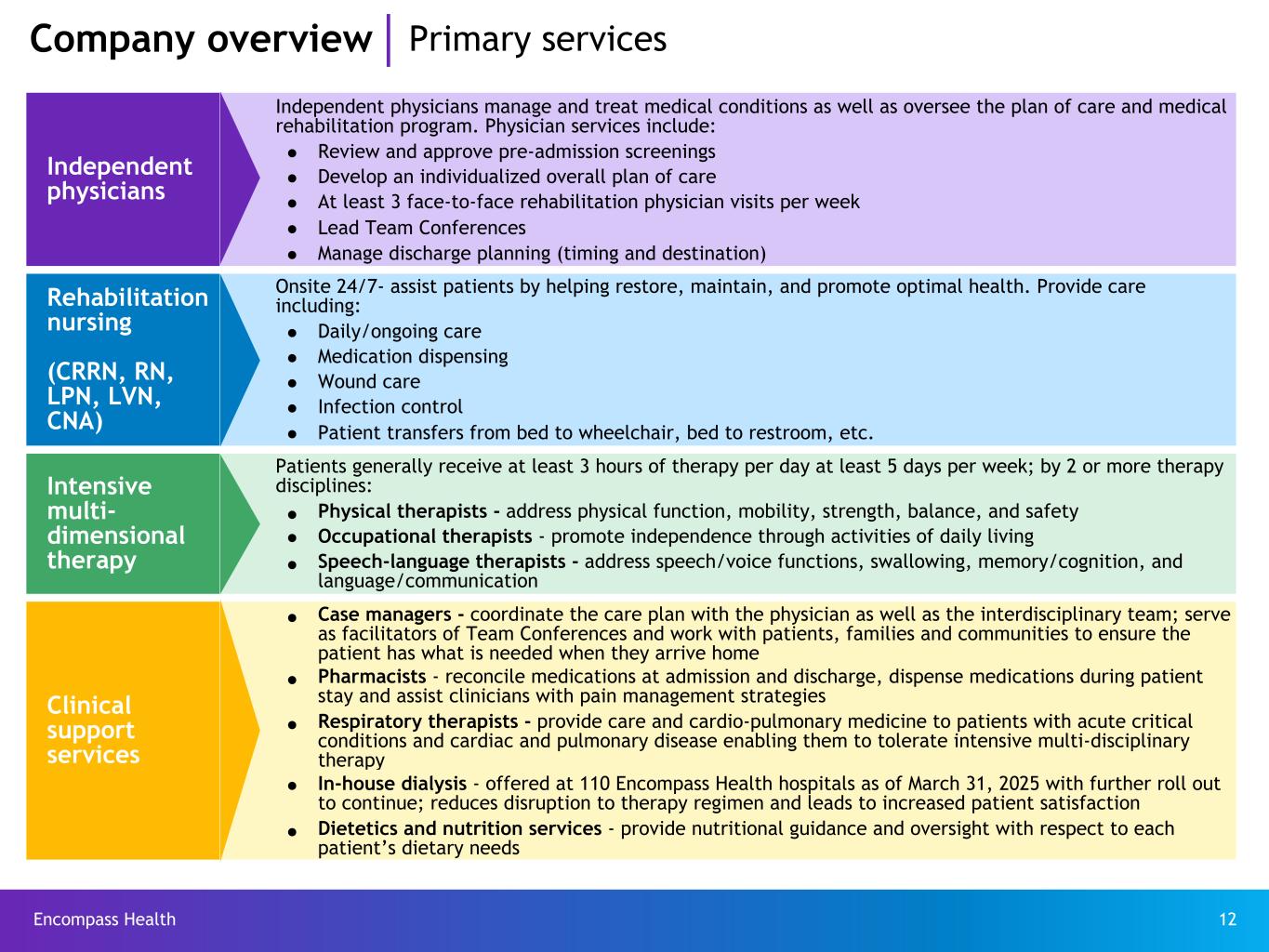 Encompass Health 12 Company overview Primary services Independent physicians Independent physicians manage and treat medical conditions as well as oversee the plan of care and medical rehabilitation program. Physician services include: Ÿ Review and approve pre-admission screenings Ÿ Develop an individualized overall plan of care Ÿ At least 3 face-to-face rehabilitation physician visits per week Ÿ Lead Team Conferences Ÿ Manage discharge planning (timing and destination) Rehabilitation nursing (CRRN, RN, LPN, LVN, CNA) Onsite 24/7- assist patients by helping restore, maintain, and promote optimal health. Provide care including: Ÿ Daily/ongoing care Ÿ Medication dispensing Ÿ Wound care Ÿ Infection control Ÿ Patient transfers from bed to wheelchair, bed to restroom, etc. Intensive multi- dimensional therapy Patients generally receive at least 3 hours of therapy per day at least 5 days per week; by 2 or more therapy disciplines: Ÿ Physical therapists - address physical function, mobility, strength, balance, and safety Ÿ Occupational therapists - promote independence through activities of daily living Ÿ Speech-language therapists - address speech/voice functions, swallowing, memory/cognition, and language/communication Clinical support services Ÿ Case managers - coordinate the care plan with the physician as well as the interdisciplinary team; serve as facilitators of Team Conferences and work with patients, families and communities to ensure the patient has what is needed when they arrive home Ÿ Pharmacists - reconcile medications at admission and discharge, dispense medications during patient stay and assist clinicians with pain management strategies Ÿ Respiratory therapists - provide care and cardio-pulmonary medicine to patients with acute critical conditions and cardiac and pulmonary disease enabling them to tolerate intensive multi-disciplinary therapy Ÿ In-house dialysis - offered at 110 Encompass Health hospitals as of March 31, 2025 with further roll out to continue; reduces disruption to therapy regimen and leads to increased patient satisfaction Ÿ Dietetics and nutrition services - provide nutritional guidance and oversight with respect to each patient’s dietary needs