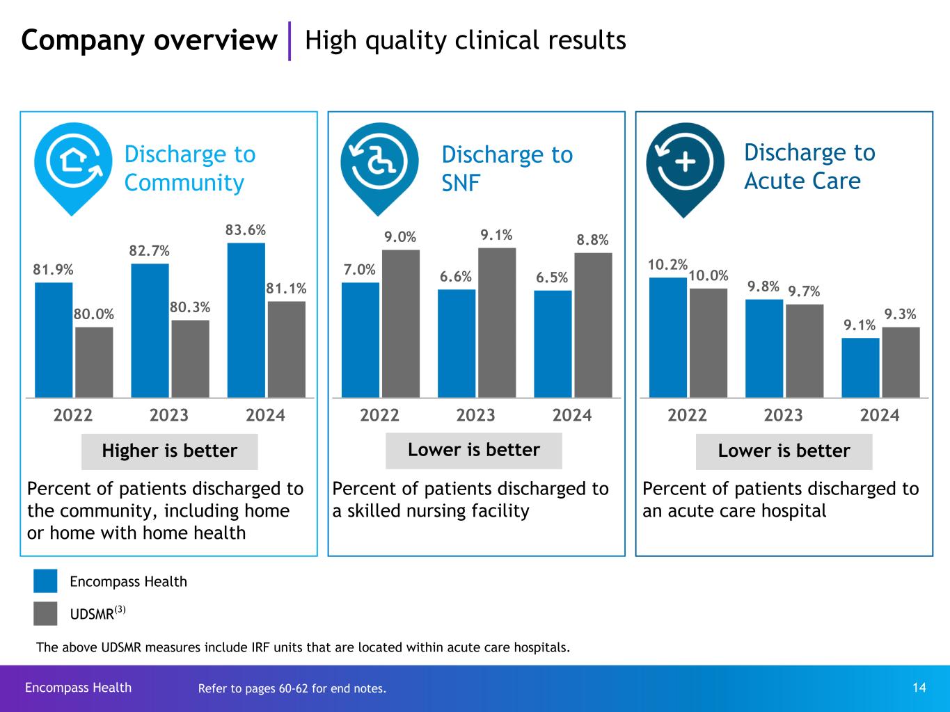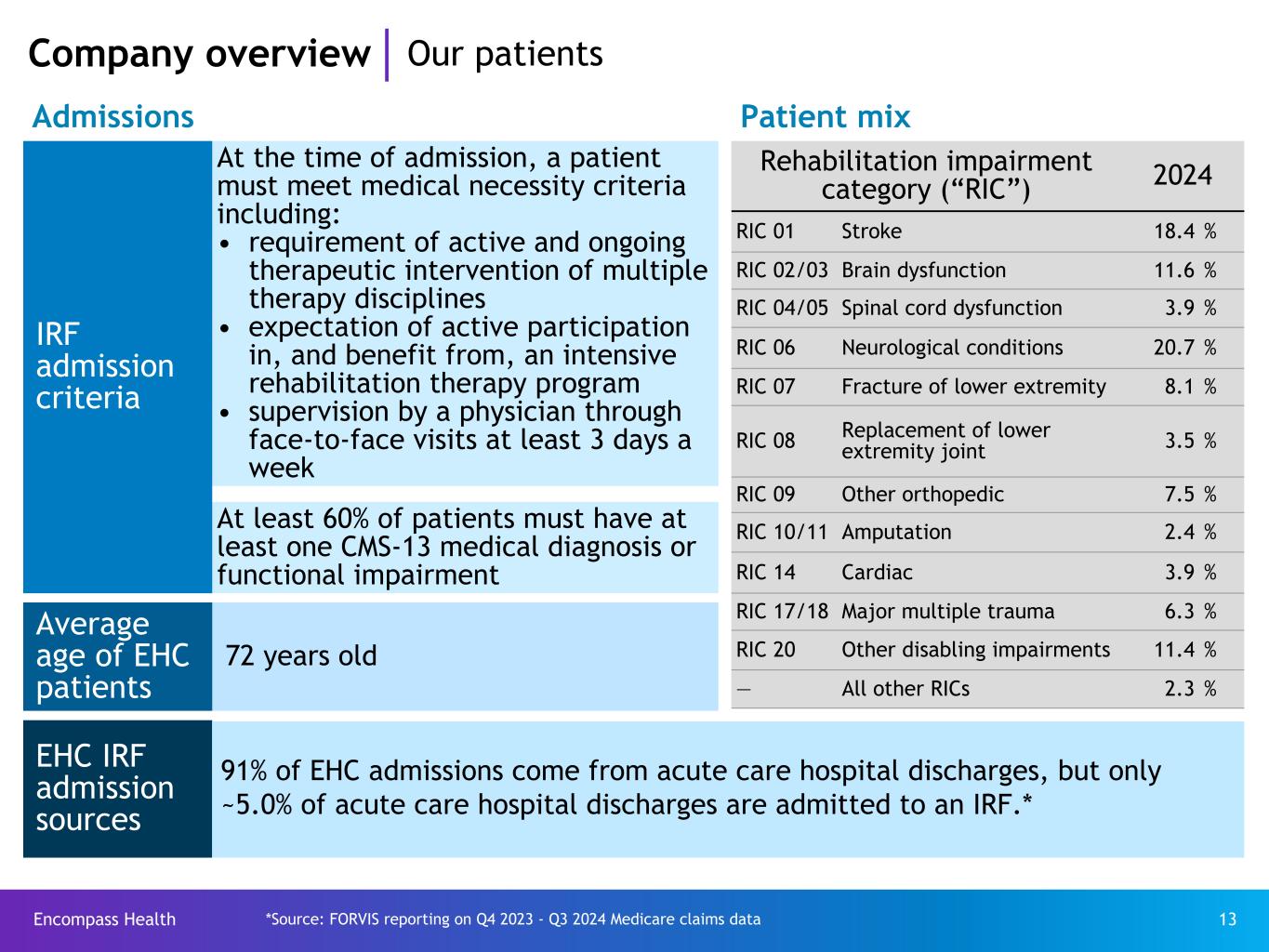 Encompass Health 13 Company overview Our patients IRF admission criteria At the time of admission, a patient must meet medical necessity criteria including: • requirement of active and ongoing therapeutic intervention of multiple therapy disciplines • expectation of active participation in, and benefit from, an intensive rehabilitation therapy program • supervision by a physician through face-to-face visits at least 3 days a week At least 60% of patients must have at least one CMS-13 medical diagnosis or functional impairment Average age of EHC patients 72 years old EHC IRF admission sources Rehabilitation impairment category (“RIC”) 2024 RIC 01 Stroke 18.4 % RIC 02/03 Brain dysfunction 11.6 % RIC 04/05 Spinal cord dysfunction 3.9 % RIC 06 Neurological conditions 20.7 % RIC 07 Fracture of lower extremity 8.1 % RIC 08 Replacement of lower extremity joint 3.5 % RIC 09 Other orthopedic 7.5 % RIC 10/11 Amputation 2.4 % RIC 14 Cardiac 3.9 % RIC 17/18 Major multiple trauma 6.3 % RIC 20 Other disabling impairments 11.4 % — All other RICs 2.3 % 91% of EHC admissions come from acute care hospital discharges, but only ~5.0% of acute care hospital discharges are admitted to an IRF.* Admissions Patient mix *Source: FORVIS reporting on Q4 2023 - Q3 2024 Medicare claims data