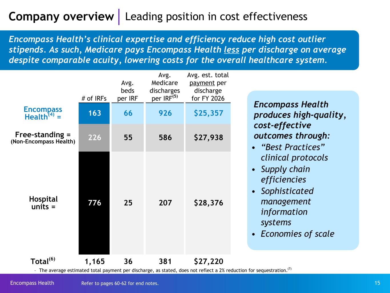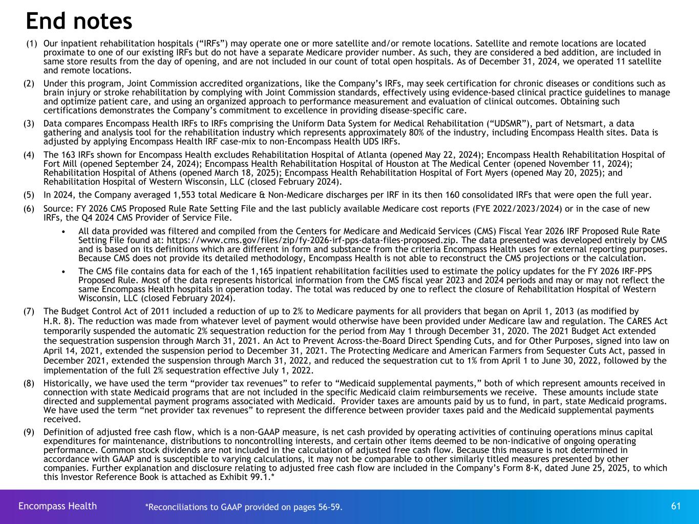Encompass Health 61 (1) Our inpatient rehabilitation hospitals (“IRFs”) may operate one or more satellite and/or remote locations. Satellite and remote locations are located proximate to one of our existing IRFs but do not have a separate Medicare provider number. As such, they are considered a bed addition, are included in same store results from the day of opening, and are not included in our count of total open hospitals. As of December 31, 2024, we operated 11 satellite and remote locations. (2) Under this program, Joint Commission accredited organizations, like the Company’s IRFs, may seek certification for chronic diseases or conditions such as brain injury or stroke rehabilitation by complying with Joint Commission standards, effectively using evidence-based clinical practice guidelines to manage and optimize patient care, and using an organized approach to performance measurement and evaluation of clinical outcomes. Obtaining such certifications demonstrates the Company’s commitment to excellence in providing disease-specific care. (3) Data compares Encompass Health IRFs to IRFs comprising the Uniform Data System for Medical Rehabilitation (“UDSMR”), part of Netsmart, a data gathering and analysis tool for the rehabilitation industry which represents approximately 80% of the industry, including Encompass Health sites. Data is adjusted by applying Encompass Health IRF case-mix to non-Encompass Health UDS IRFs. (4) The 163 IRFs shown for Encompass Health excludes Rehabilitation Hospital of Atlanta (opened May 22, 2024); Encompass Health Rehabilitation Hospital of Fort Mill (opened September 24, 2024); Encompass Health Rehabilitation Hospital of Houston at The Medical Center (opened November 11, 2024); Rehabilitation Hospital of Athens (opened March 18, 2025); Encompass Health Rehabilitation Hospital of Fort Myers (opened May 20, 2025); and Rehabilitation Hospital of Western Wisconsin, LLC (closed February 2024). (5) In 2024, the Company averaged 1,553 total Medicare & Non-Medicare discharges per IRF in its then 160 consolidated IRFs that were open the full year. (6) Source: FY 2026 CMS Proposed Rule Rate Setting File and the last publicly available Medicare cost reports (FYE 2022/2023/2024) or in the case of new IRFs, the Q4 2024 CMS Provider of Service File. • All data provided was filtered and compiled from the Centers for Medicare and Medicaid Services (CMS) Fiscal Year 2026 IRF Proposed Rule Rate Setting File found at: https://www.cms.gov/files/zip/fy-2026-irf-pps-data-files-proposed.zip. The data presented was developed entirely by CMS and is based on its definitions which are different in form and substance from the criteria Encompass Health uses for external reporting purposes. Because CMS does not provide its detailed methodology, Encompass Health is not able to reconstruct the CMS projections or the calculation. • The CMS file contains data for each of the 1,165 inpatient rehabilitation facilities used to estimate the policy updates for the FY 2026 IRF-PPS Proposed Rule. Most of the data represents historical information from the CMS fiscal year 2023 and 2024 periods and may or may not reflect the same Encompass Health hospitals in operation today. The total was reduced by one to reflect the closure of Rehabilitation Hospital of Western Wisconsin, LLC (closed February 2024). (7) The Budget Control Act of 2011 included a reduction of up to 2% to Medicare payments for all providers that began on April 1, 2013 (as modified by H.R. 8). The reduction was made from whatever level of payment would otherwise have been provided under Medicare law and regulation. The CARES Act temporarily suspended the automatic 2% sequestration reduction for the period from May 1 through December 31, 2020. The 2021 Budget Act extended the sequestration suspension through March 31, 2021. An Act to Prevent Across-the-Board Direct Spending Cuts, and for Other Purposes, signed into law on April 14, 2021, extended the suspension period to December 31, 2021. The Protecting Medicare and American Farmers from Sequester Cuts Act, passed in December 2021, extended the suspension through March 31, 2022, and reduced the sequestration cut to 1% from April 1 to June 30, 2022, followed by the implementation of the full 2% sequestration effective July 1, 2022. (8) Historically, we have used the term “provider tax revenues” to refer to “Medicaid supplemental payments,” both of which represent amounts received in connection with state Medicaid programs that are not included in the specific Medicaid claim reimbursements we receive. These amounts include state directed and supplemental payment programs associated with Medicaid. Provider taxes are amounts paid by us to fund, in part, state Medicaid programs. We have used the term “net provider tax revenues” to represent the difference between provider taxes paid and the Medicaid supplemental payments received. (9) Definition of adjusted free cash flow, which is a non-GAAP measure, is net cash provided by operating activities of continuing operations minus capital expenditures for maintenance, distributions to noncontrolling interests, and certain other items deemed to be non-indicative of ongoing operating performance. Common stock dividends are not included in the calculation of adjusted free cash flow. Because this measure is not determined in accordance with GAAP and is susceptible to varying calculations, it may not be comparable to other similarly titled measures presented by other companies. Further explanation and disclosure relating to adjusted free cash flow are included in the Company’s Form 8-K, dated June 25, 2025, to which this Investor Reference Book is attached as Exhibit 99.1.* End notes *Reconciliations to GAAP provided on pages 56-59.