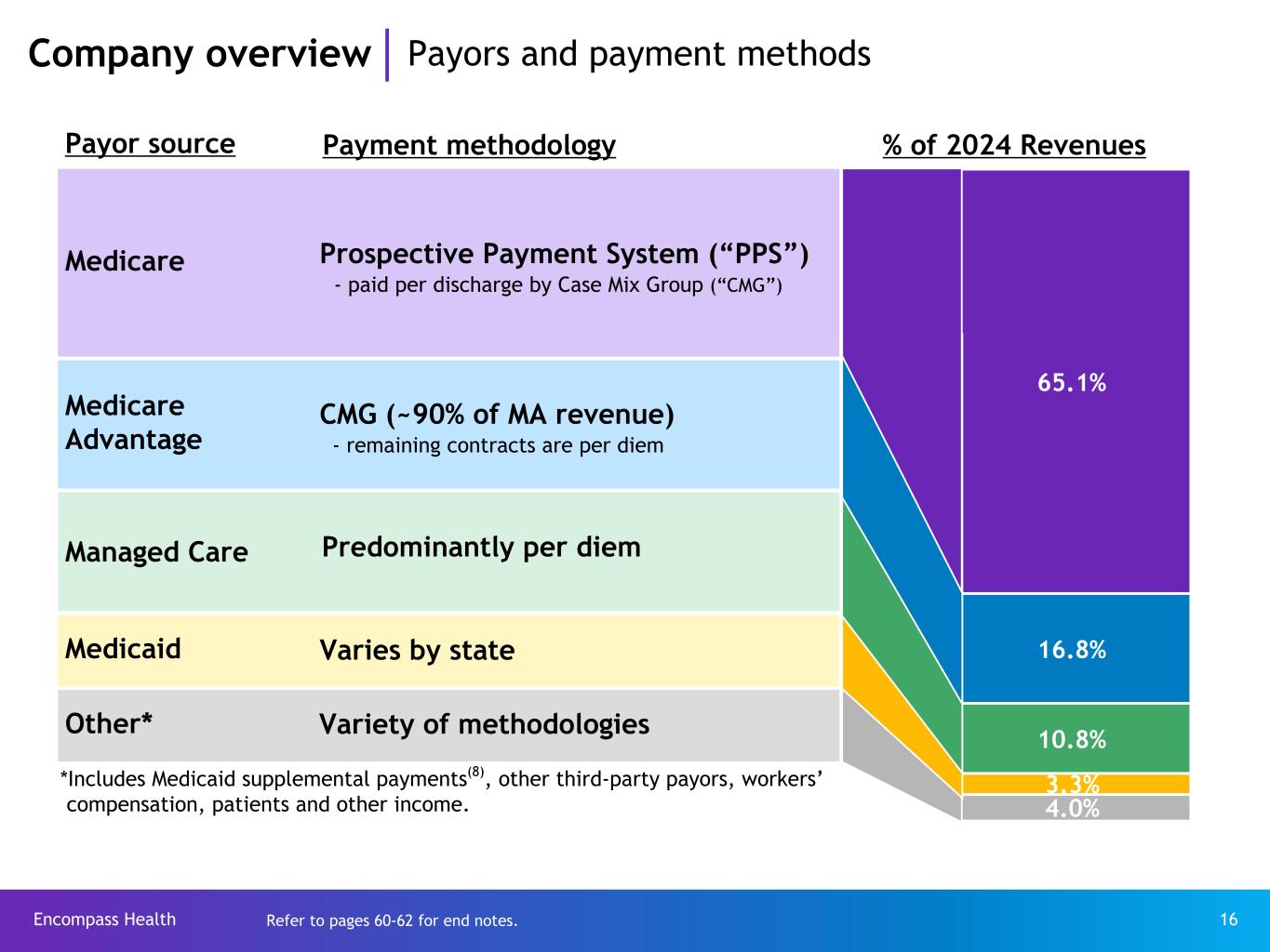 Encompass Health 15 # of IRFs Avg. beds per IRF Avg. Medicare discharges per IRF(5) Avg. est. total payment per discharge for FY 2026 Encompass Health(4) = 163 66 926 $25,357 Free-standing = (Non-Encompass Health) 226 55 586 $27,938 Hospital units = 776 25 207 $28,376 Total(6) 1,165 36 381 $27,220 Encompass Health’s clinical expertise and efficiency reduce high cost outlier stipends. As such, Medicare pays Encompass Health less per discharge on average despite comparable acuity, lowering costs for the overall healthcare system. Company overview Leading position in cost effectiveness – The average estimated total payment per discharge, as stated, does not reflect a 2% reduction for sequestration.(7) Refer to pages 60-62 for end notes. Encompass Health produces high-quality, cost-effective outcomes through: • “Best Practices” clinical protocols • Supply chain efficiencies • Sophisticated management information systems • Economies of scale