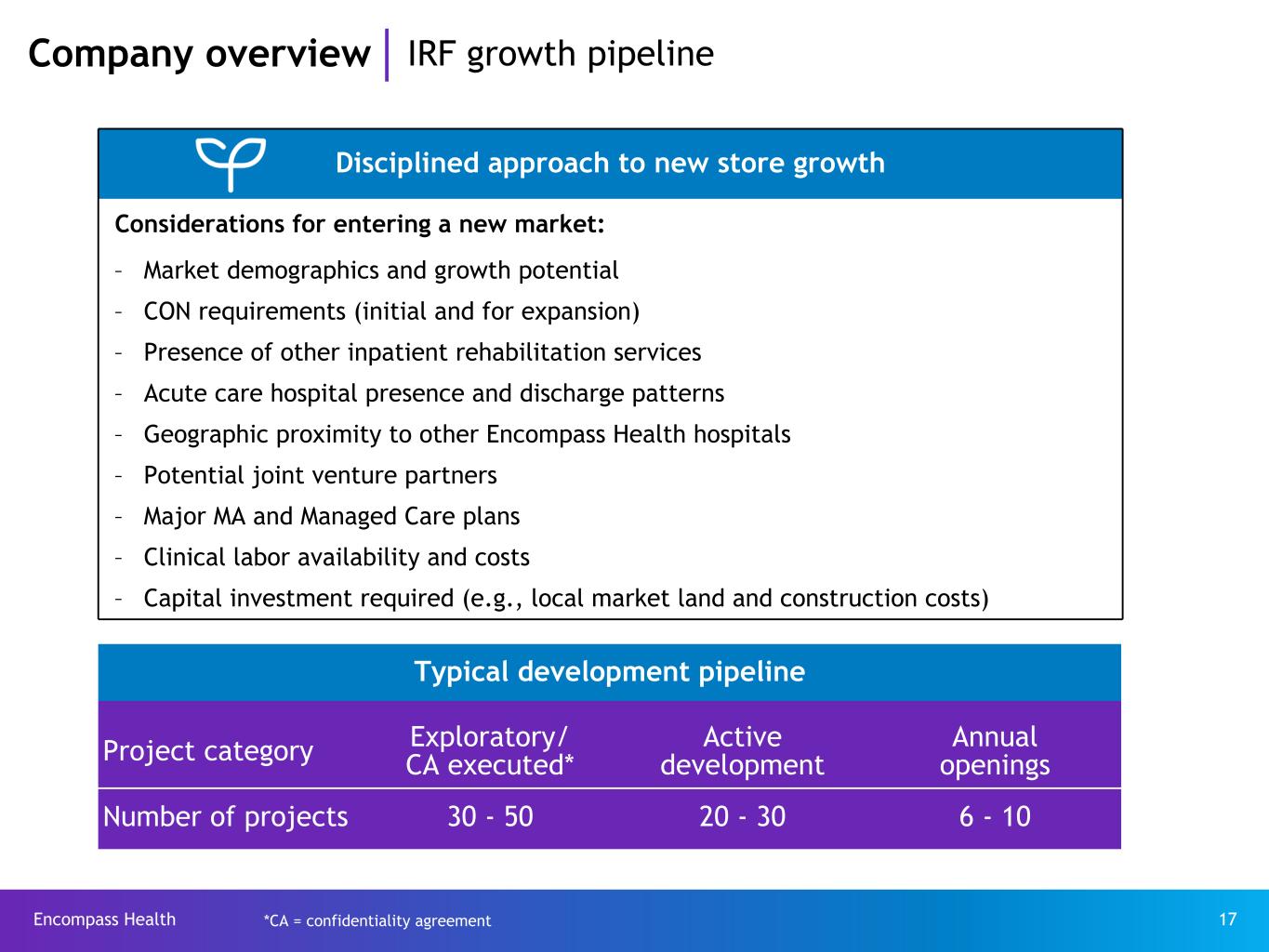Encompass Health 16 65.1% 16.8% 10.8% 3.3% 4.0% % of 2024 Revenues Medicare Prospective Payment System (“PPS”) - paid per discharge by Case Mix Group (“CMG”) Medicare Advantage CMG (~90% of MA revenue) - remaining contracts are per diem Managed Care Predominantly per diem Medicaid Varies by state Other* Variety of methodologies Payor source Payment methodology Company overview Payors and payment methods *Includes Medicaid supplemental payments(8), other third-party payors, workers’ compensation, patients and other income. Refer to pages 60-62 for end notes.