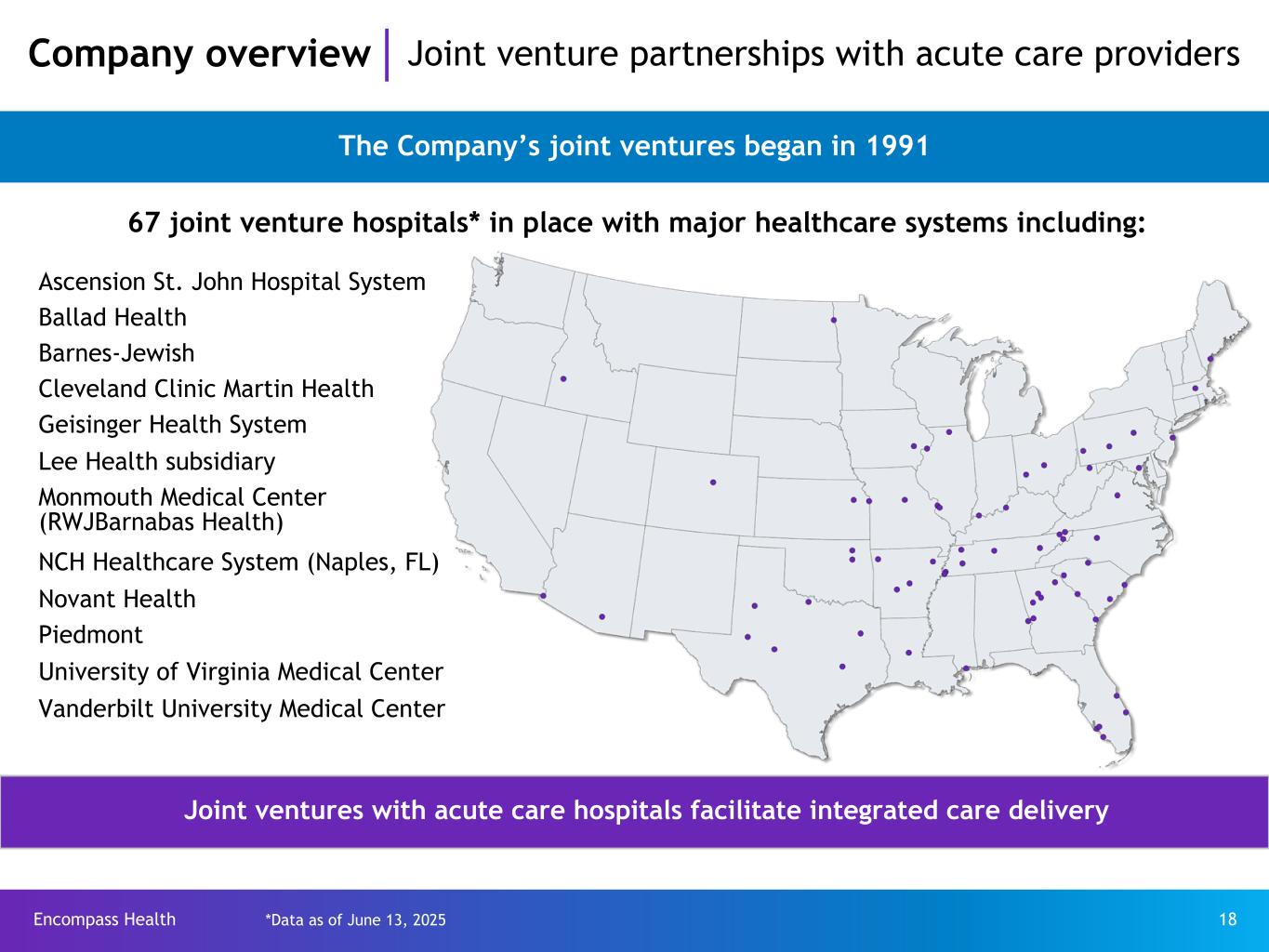 Encompass Health 18 67 joint venture hospitals* in place with major healthcare systems including: Joint ventures with acute care hospitals facilitate integrated care delivery Ascension St. John Hospital System Ballad Health Barnes-Jewish Cleveland Clinic Martin Health Geisinger Health System Lee Health subsidiary Monmouth Medical Center (RWJBarnabas Health) NCH Healthcare System (Naples, FL) Novant Health Piedmont University of Virginia Medical Center Vanderbilt University Medical Center Company overview Joint venture partnerships with acute care providers The Company’s joint ventures began in 1991 *Data as of June 13, 2025