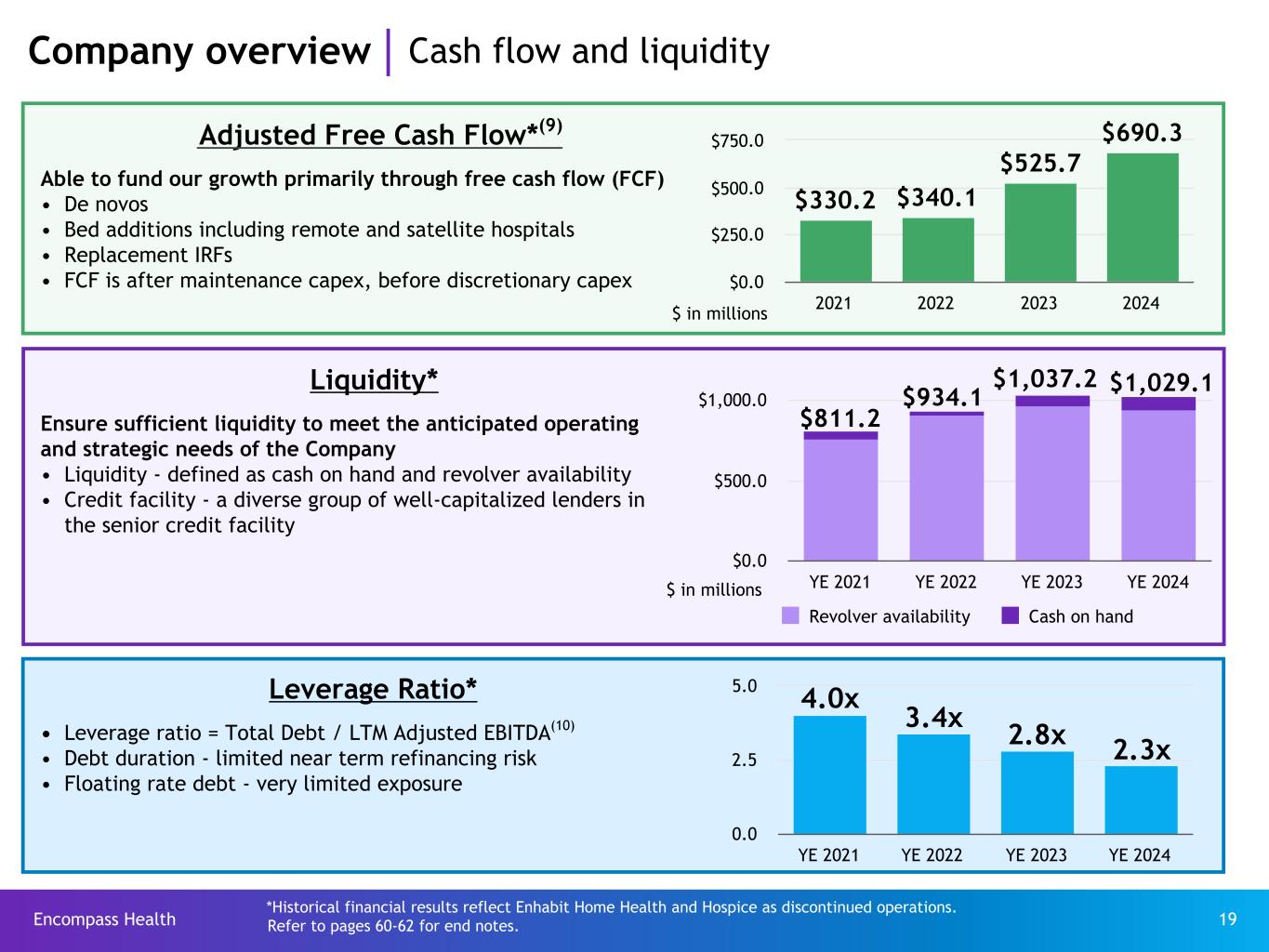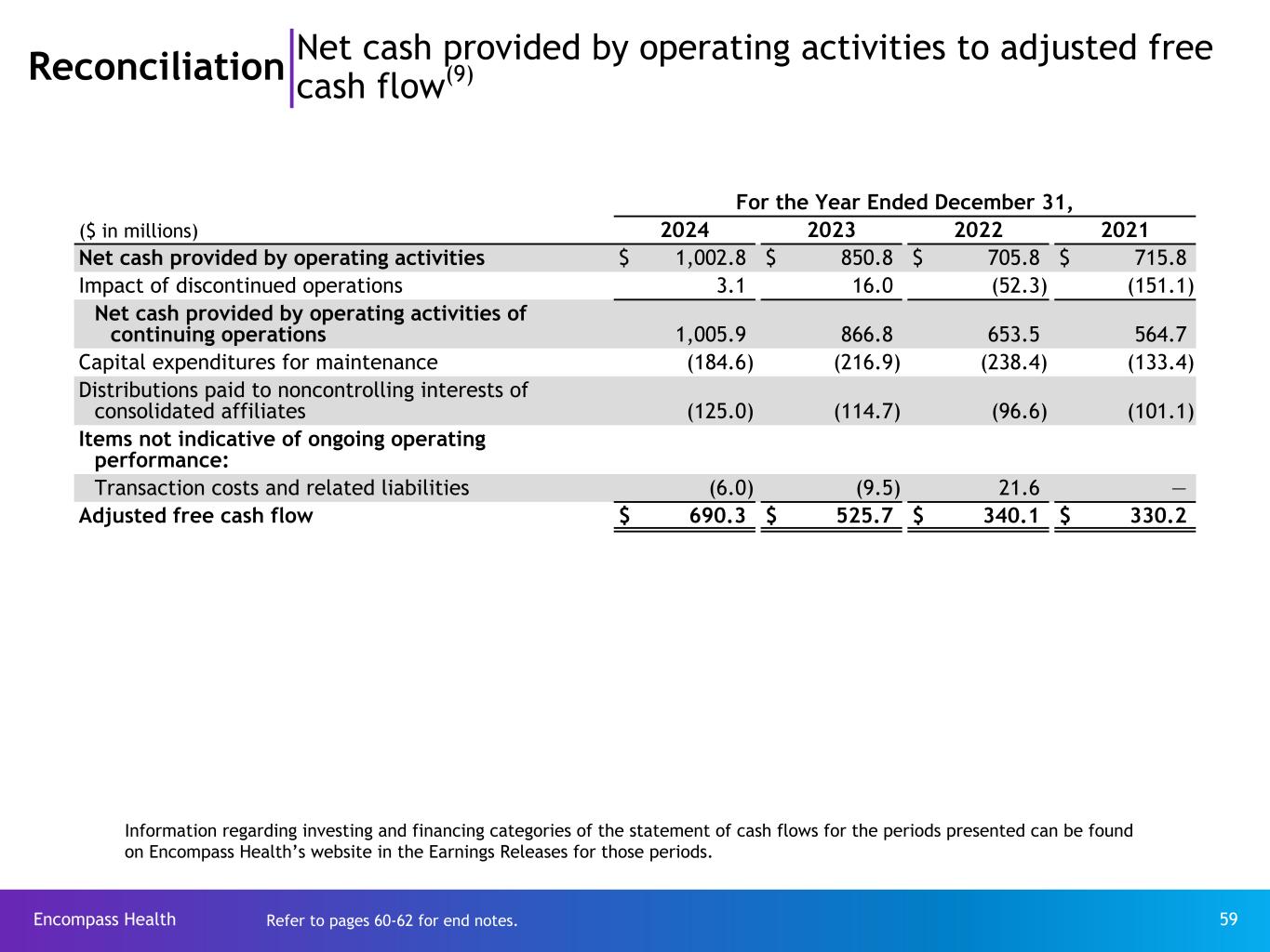 Encompass Health 59 Reconciliation Net cash provided by operating activities to adjusted free cash flow(9) For the Year Ended December 31, ($ in millions) 2024 2023 2022 2021 Net cash provided by operating activities $ 1,002.8 $ 850.8 $ 705.8 $ 715.8 Impact of discontinued operations 3.1 16.0 (52.3) (151.1) Net cash provided by operating activities of continuing operations 1,005.9 866.8 653.5 564.7 Capital expenditures for maintenance (184.6) (216.9) (238.4) (133.4) Distributions paid to noncontrolling interests of consolidated affiliates (125.0) (114.7) (96.6) (101.1) Items not indicative of ongoing operating performance: Transaction costs and related liabilities (6.0) (9.5) 21.6 — Adjusted free cash flow $ 690.3 $ 525.7 $ 340.1 $ 330.2 Information regarding investing and financing categories of the statement of cash flows for the periods presented can be found on Encompass Health’s website in the Earnings Releases for those periods. Refer to pages 60-62 for end notes.