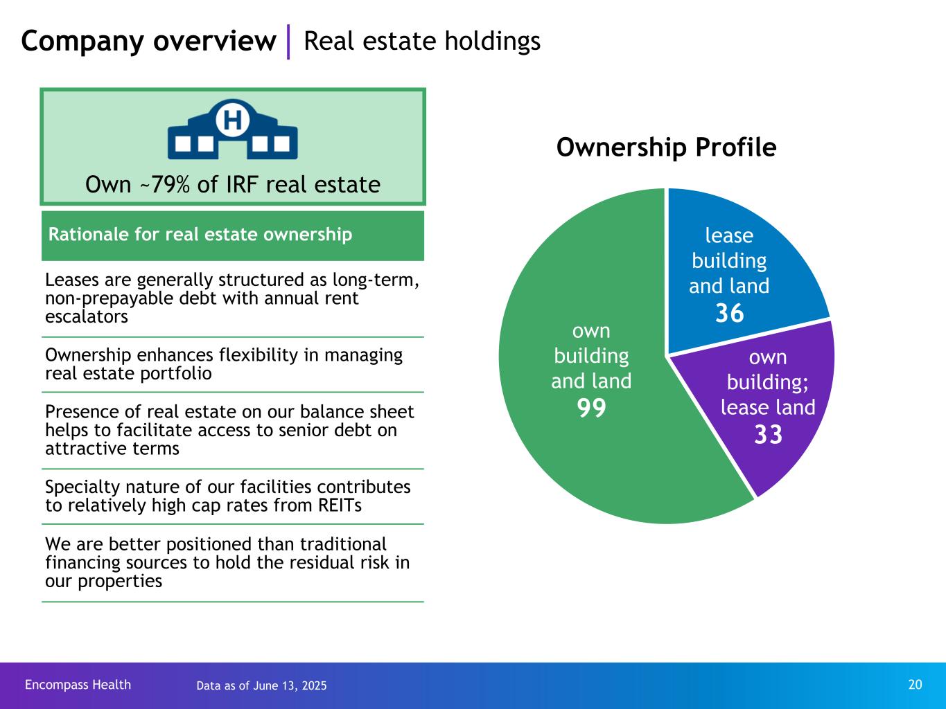 Encompass Health 19 Company overview Cash flow and liquidity $330.2 $340.1 $525.7 $690.3 2021 2022 2023 2024 $0.0 $250.0 $500.0 $750.0 YE 2021 YE 2022 YE 2023 YE 2024 0.0 2.5 5.0 *Historical financial results reflect Enhabit Home Health and Hospice as discontinued operations. Adjusted Free Cash Flow*(9) Able to fund our growth primarily through free cash flow (FCF) • De novos • Bed additions including remote and satellite hospitals • Replacement IRFs • FCF is after maintenance capex, before discretionary capex $ in millions $ in millions Liquidity* Ensure sufficient liquidity to meet the anticipated operating and strategic needs of the Company • Liquidity - defined as cash on hand and revolver availability • Credit facility - a diverse group of well-capitalized lenders in the senior credit facility Leverage Ratio* • Leverage ratio = Total Debt / LTM Adjusted EBITDA(10) • Debt duration - limited near term refinancing risk • Floating rate debt - very limited exposure 4.0x 3.4x Revolver availability Cash on hand YE 2021 YE 2022 YE 2023 YE 2024 $0.0 $500.0 $1,000.0 $811.2 $934.1 $1,037.2 2.8x $1,029.1 2.3x Refer to pages 60-62 for end notes.
