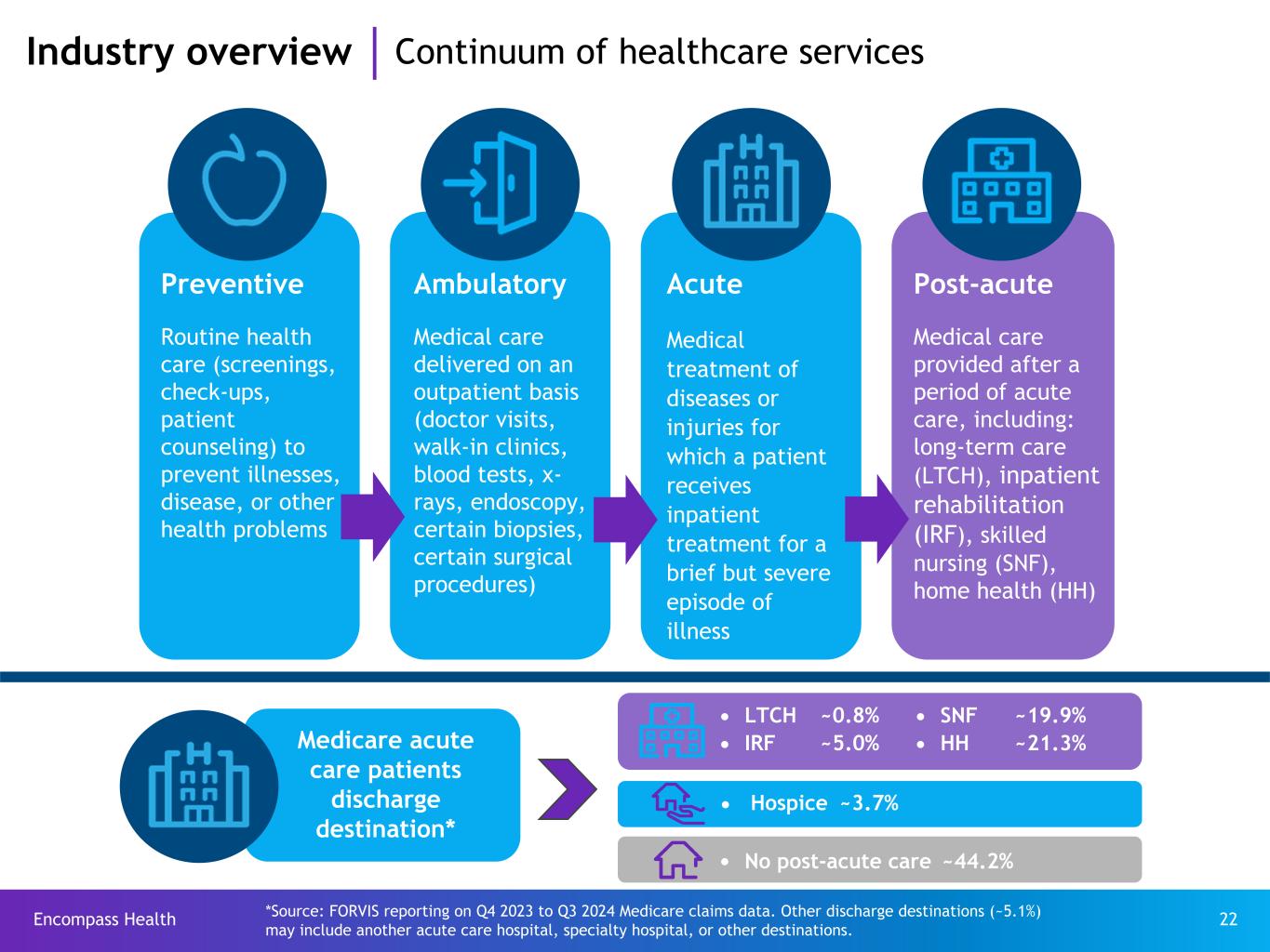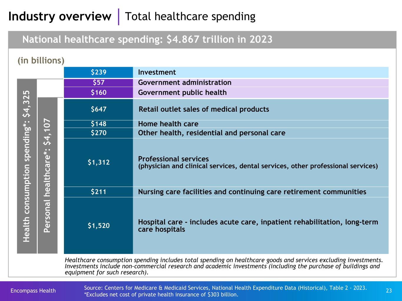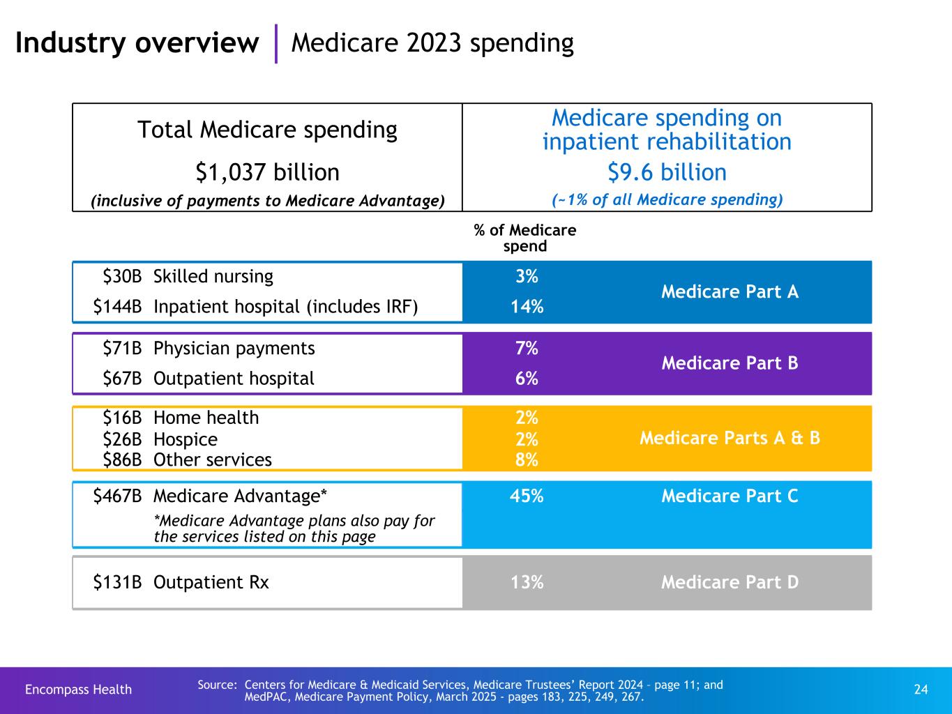 Encompass Health 23 H ea lt h co ns um pt io n sp en di ng *: $ 4, 32 5 (in billions) National healthcare spending: $4.867 trillion in 2023 Pe rs on al h ea lt hc ar e* : $4 ,1 07 $239 Investment $57 Government administration $160 Government public health $647 Retail outlet sales of medical products $148 Home health care $270 Other health, residential and personal care $1,312 Professional services (physician and clinical services, dental services, other professional services) $211 Nursing care facilities and continuing care retirement communities $1,520 Hospital care - includes acute care, inpatient rehabilitation, long-term care hospitals Healthcare consumption spending includes total spending on healthcare goods and services excluding investments. Investments include non-commercial research and academic investments (including the purchase of buildings and equipment for such research). Industry overview Total healthcare spending Source: Centers for Medicare & Medicaid Services, National Health Expenditure Data (Historical), Table 2 - 2023. *Excludes net cost of private health insurance of $303 billion.