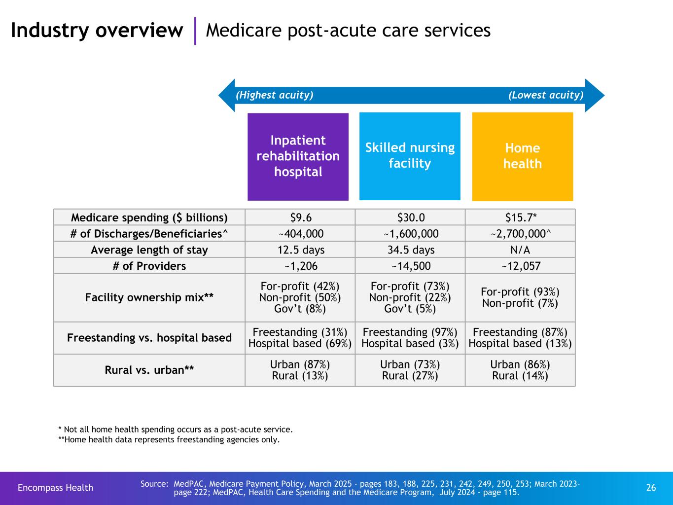 Encompass Health 25 60% or more of an IRF’s annual admissions must have at least one medical diagnosis or functional impairment from a list of 13 qualifying conditions (“CMS-13”). Industry overview IRF qualifying conditions CMS-13 qualifying conditions 1 Stroke 2 Brain injury 3 Amputation 4 Spinal cord 5 Fracture of the femur 6 Neurological disorder 7 Multiple trauma 8 Congenital deformity 9 Burns 10 Osteoarthritis (after less intensive setting) 11 Rheumatoid arthritis (after less intensive setting) 12 Joint replacement - Bilateral - Age ≥ 85 - Body mass index > 50 13 Systemic vasculidities (after less intensive setting) Other IRF qualification requirements at the time of a patient’s admission ü Physician approval of preadmission screen and admission ü Patient requires the active and ongoing therapeutic intervention of multiple therapy disciplines, one of which must be physical or occupational therapy ü Patient can reasonably be expected to actively participate in, and benefit from, an intensive interdisciplinary rehabilitation therapy program of 3 hours of therapy a day, 5 days a week ü Requires supervision by a physician through face-to-face visits at least 3 days per week during the patient’s stay to assess the patient both medically and functionally, as well as to modify the course of treatment as needed