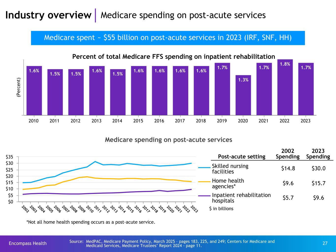 Encompass Health 24Source: Centers for Medicare & Medicaid Services, Medicare Trustees’ Report 2024 – page 11; and MedPAC, Medicare Payment Policy, March 2025 - pages 183, 225, 249, 267. 12% 2% 8% 4% 9% 42% 17%3% 3% Industry overview Medicare 2023 spending Total Medicare spending Medicare spending on inpatient rehabilitation $1,037 billion $9.6 billion (inclusive of payments to Medicare Advantage) (~1% of all Medicare spending) % of Medicare spend $30B Skilled nursing 3% Medicare Part A $144B Inpatient hospital (includes IRF) 14% $71B Physician payments 7% Medicare Part B $67B Outpatient hospital 6% $16B Home health 2% Medicare Parts A & B$26B Hospice 2% $86B Other services 8% $467B Medicare Advantage* 45% Medicare Part C *Medicare Advantage plans also pay for the services listed on this page $131B Outpatient Rx 13% Medicare Part D