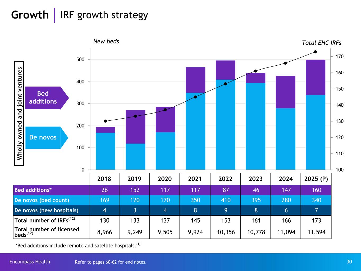 Encompass Health 30 0 100 200 300 400 500 100 110 120 130 140 150 160 170 2018 2019 2020 2021 2022 2023 2024 2025 (P) Bed additions* 26 152 117 117 87 46 147 160 De novos (bed count) 169 120 170 350 410 395 280 340 De novos (new hospitals) 4 3 4 8 9 8 6 7 Total number of IRFs(12) 130 133 137 145 153 161 166 173 Total number of licensed beds(12) 8,966 9,249 9,505 9,924 10,356 10,778 11,094 11,594 Total EHC IRFsNew beds W ho lly o w ne d an d jo in t ve nt ur es Bed additions De novos Growth IRF growth strategy *Bed additions include remote and satellite hospitals.(1) Refer to pages 60-62 for end notes.