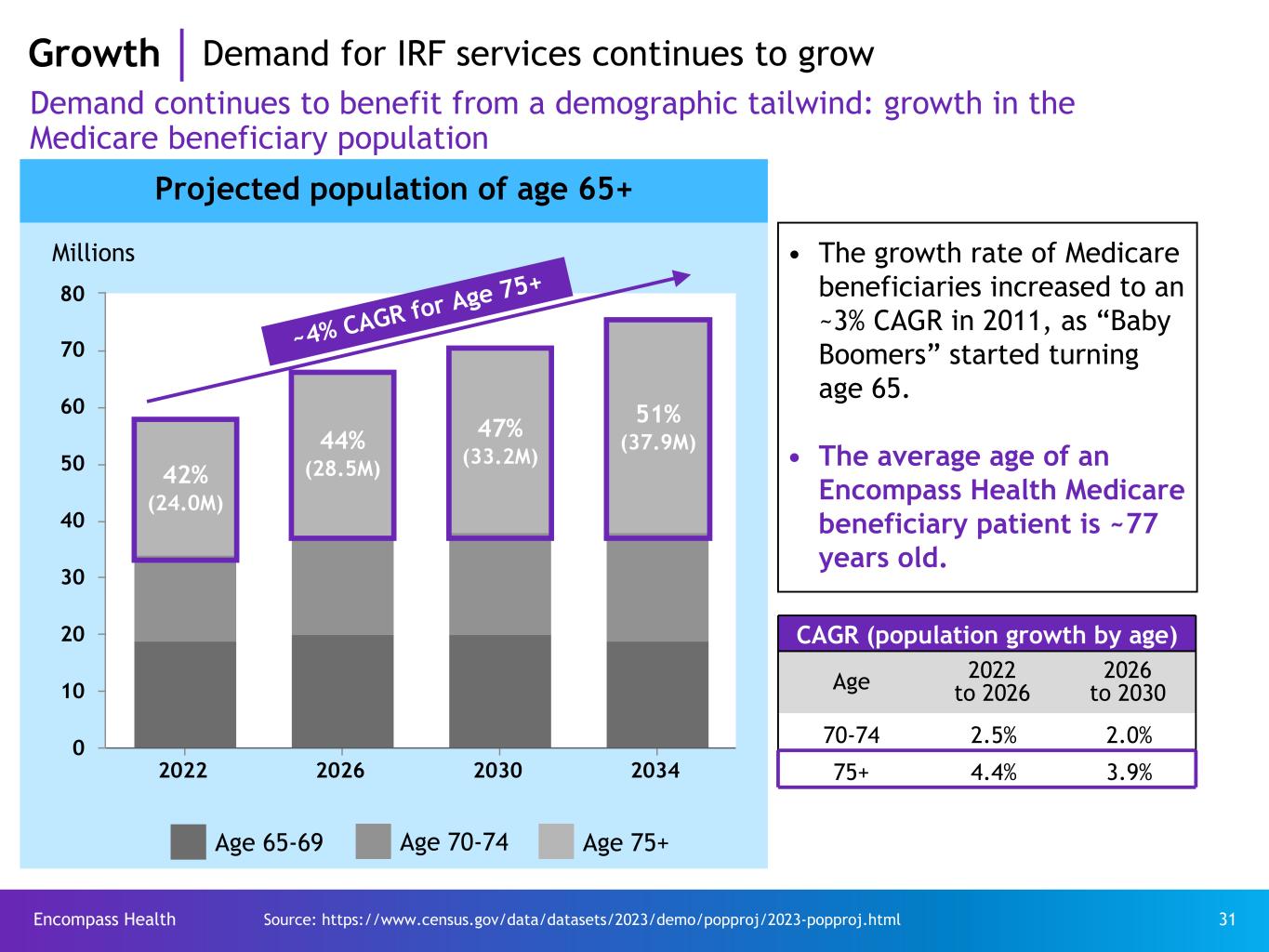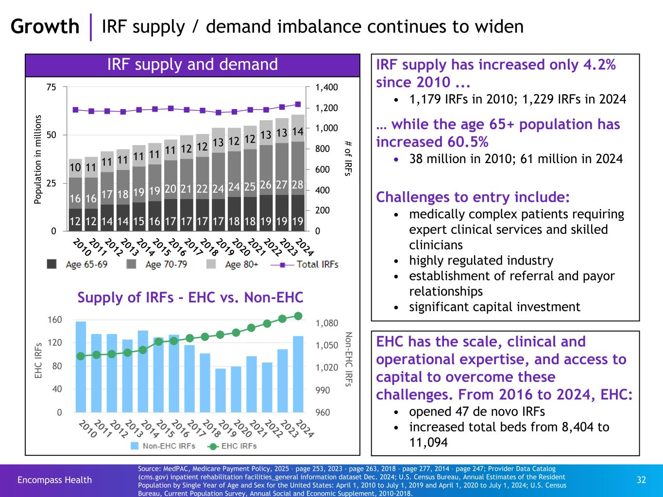 Encompass Health 31 Demand continues to benefit from a demographic tailwind: growth in the Medicare beneficiary population Age 75+Age 70-74Age 65-69 • The growth rate of Medicare beneficiaries increased to an ~3% CAGR in 2011, as “Baby Boomers” started turning age 65. • The average age of an Encompass Health Medicare beneficiary patient is ~77 years old. CAGR (population growth by age) Age 2022 to 2026 2026 to 2030 70-74 2.5% 2.0% 75+ 4.4% 3.9% Source: https://www.census.gov/data/datasets/2023/demo/popproj/2023-popproj.html 2022 2026 2030 2034 0 10 20 30 40 50 60 70 80 Projected population of age 65+ Millions 42% (24.0M) 44% (28.5M) 47% (33.2M) 51% (37.9M) ~4% CAGR for Age 75+ Growth Demand for IRF services continues to grow