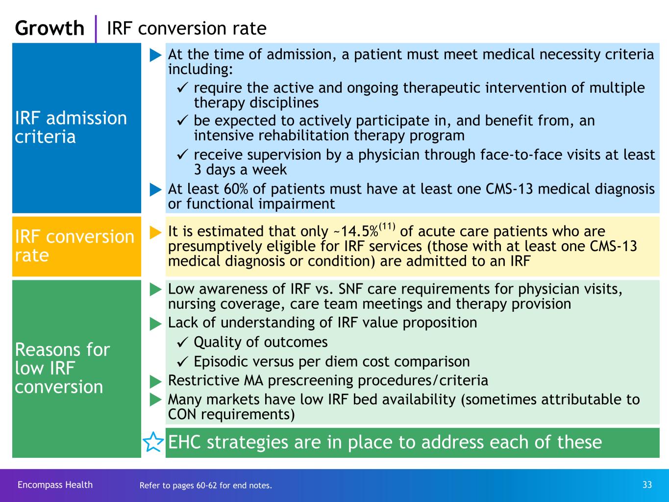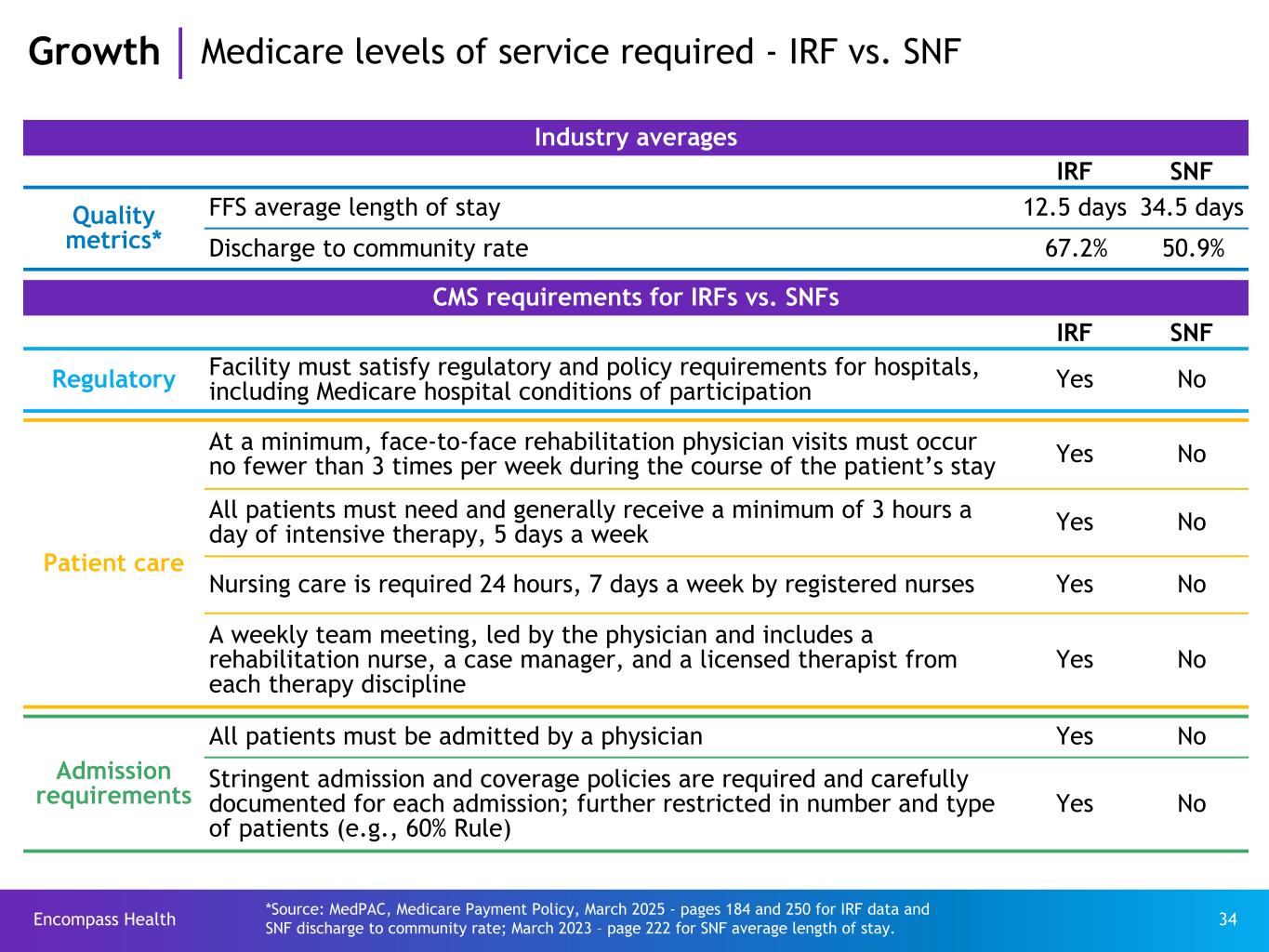 Encompass Health 33 IRF admission criteria u At the time of admission, a patient must meet medical necessity criteria including: ü require the active and ongoing therapeutic intervention of multiple therapy disciplines ü be expected to actively participate in, and benefit from, an intensive rehabilitation therapy program ü receive supervision by a physician through face-to-face visits at least 3 days a week u At least 60% of patients must have at least one CMS-13 medical diagnosis or functional impairment IRF conversion rate u It is estimated that only ~14.5%(11) of acute care patients who are presumptively eligible for IRF services (those with at least one CMS-13 medical diagnosis or condition) are admitted to an IRF Reasons for low IRF conversion u Low awareness of IRF vs. SNF care requirements for physician visits, nursing coverage, care team meetings and therapy provision u Lack of understanding of IRF value proposition ü Quality of outcomes ü Episodic versus per diem cost comparison u Restrictive MA prescreening procedures/criteria u Many markets have low IRF bed availability (sometimes attributable to CON requirements) EHC strategies are in place to address each of these Growth IRF conversion rate Refer to pages 60-62 for end notes.