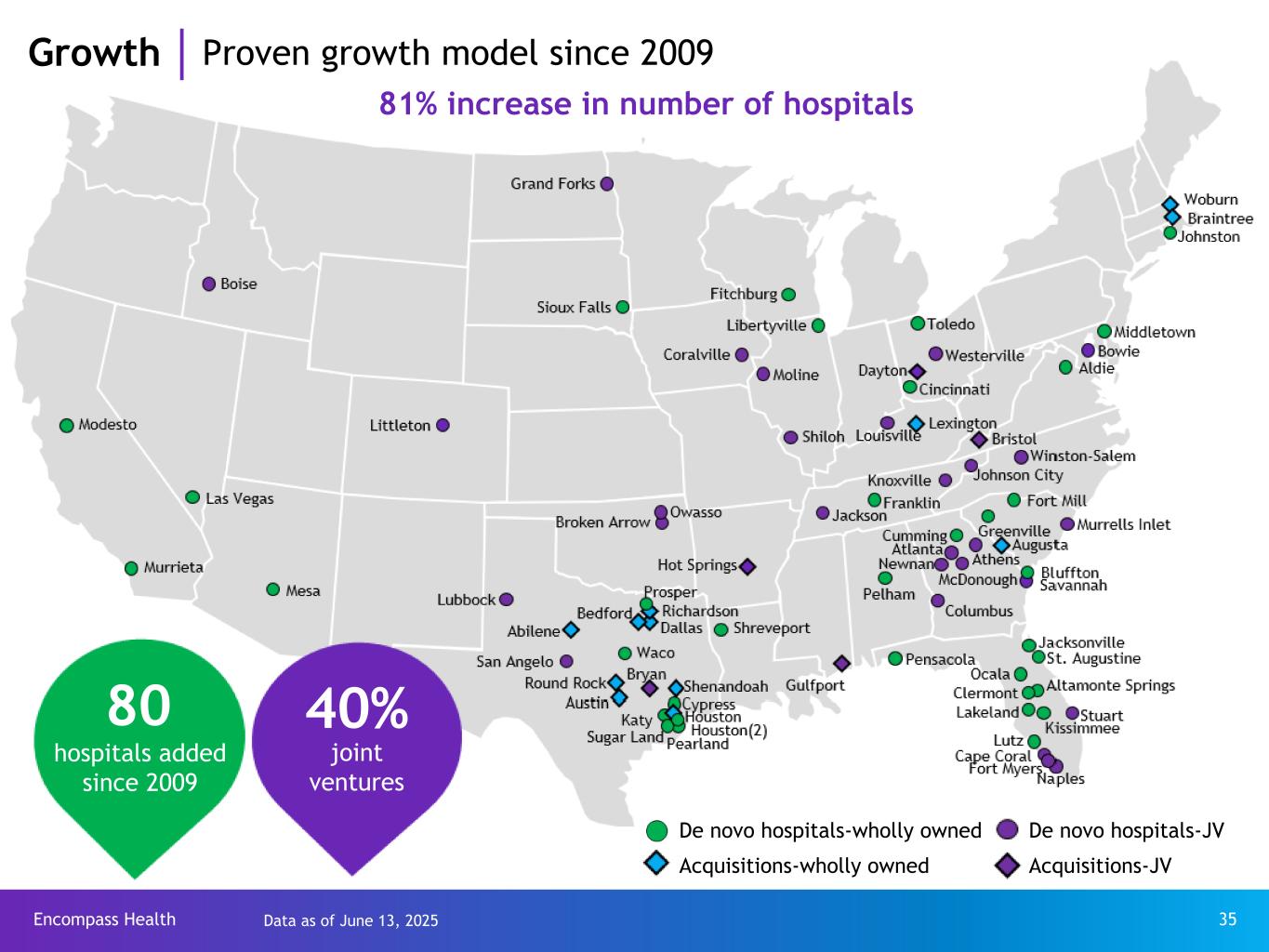 Encompass Health 34 Growth Medicare levels of service required - IRF vs. SNF Industry averages IRF SNF Quality metrics* FFS average length of stay 12.5 days 34.5 days Discharge to community rate 67.2% 50.9% CMS requirements for IRFs vs. SNFs IRF SNF Regulatory Facility must satisfy regulatory and policy requirements for hospitals, including Medicare hospital conditions of participation Yes No Patient care At a minimum, face-to-face rehabilitation physician visits must occur no fewer than 3 times per week during the course of the patient’s stay Yes No All patients must need and generally receive a minimum of 3 hours a day of intensive therapy, 5 days a week Yes No Nursing care is required 24 hours, 7 days a week by registered nurses Yes No A weekly team meeting, led by the physician and includes a rehabilitation nurse, a case manager, and a licensed therapist from each therapy discipline Yes No Admission requirements All patients must be admitted by a physician Yes No Stringent admission and coverage policies are required and carefully documented for each admission; further restricted in number and type of patients (e.g., 60% Rule) Yes No *Source: MedPAC, Medicare Payment Policy, March 2025 - pages 184 and 250 for IRF data and SNF discharge to community rate; March 2023 – page 222 for SNF average length of stay.