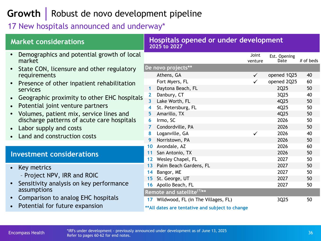 Encompass Health 35 Growth Proven growth model since 2009 46% JV hospitals De novo hospitals-wholly owned Acquisitions-wholly owned De novo hospitals-JV Acquisitions-JV 80 hospitals added since 2009 40% joint ventures 81% increase in number of hospitals Data as of June 13, 2025