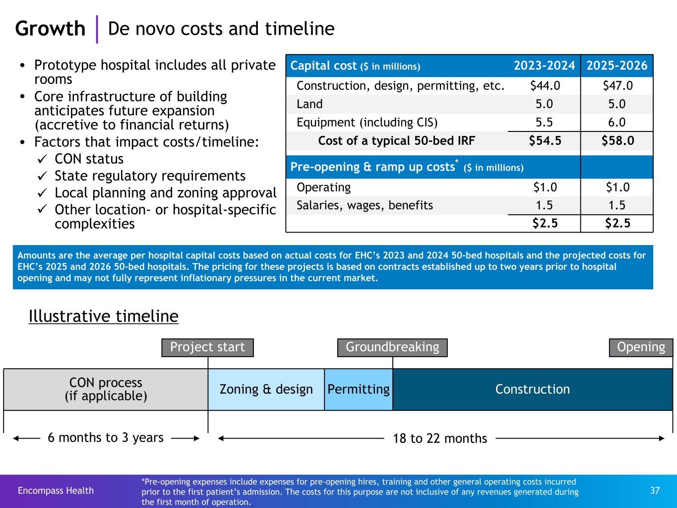Encompass Health 37 CON process (if applicable) Zoning & design Permitting Construction OpeningGroundbreaking Capital cost ($ in millions) 2023-2024 2025-2026 Construction, design, permitting, etc. $44.0 $47.0 Land 5.0 5.0 Equipment (including CIS) 5.5 6.0 Cost of a typical 50-bed IRF $54.5 $58.0 Pre-opening & ramp up costs* ($ in millions) Operating $1.0 $1.0 Salaries, wages, benefits 1.5 1.5 $2.5 $2.5 Project start 18 to 22 months6 months to 3 years Illustrative timeline *Pre-opening expenses include expenses for pre-opening hires, training and other general operating costs incurred prior to the first patient’s admission. The costs for this purpose are not inclusive of any revenues generated during the first month of operation. Growth De novo costs and timeline Amounts are the average per hospital capital costs based on actual costs for EHC’s 2023 and 2024 50-bed hospitals and the projected costs for EHC’s 2025 and 2026 50-bed hospitals. The pricing for these projects is based on contracts established up to two years prior to hospital opening and may not fully represent inflationary pressures in the current market. Ÿ Prototype hospital includes all private rooms Ÿ Core infrastructure of building anticipates future expansion (accretive to financial returns) Ÿ Factors that impact costs/timeline: ü CON status ü State regulatory requirements ü Local planning and zoning approval ü Other location- or hospital-specific complexities