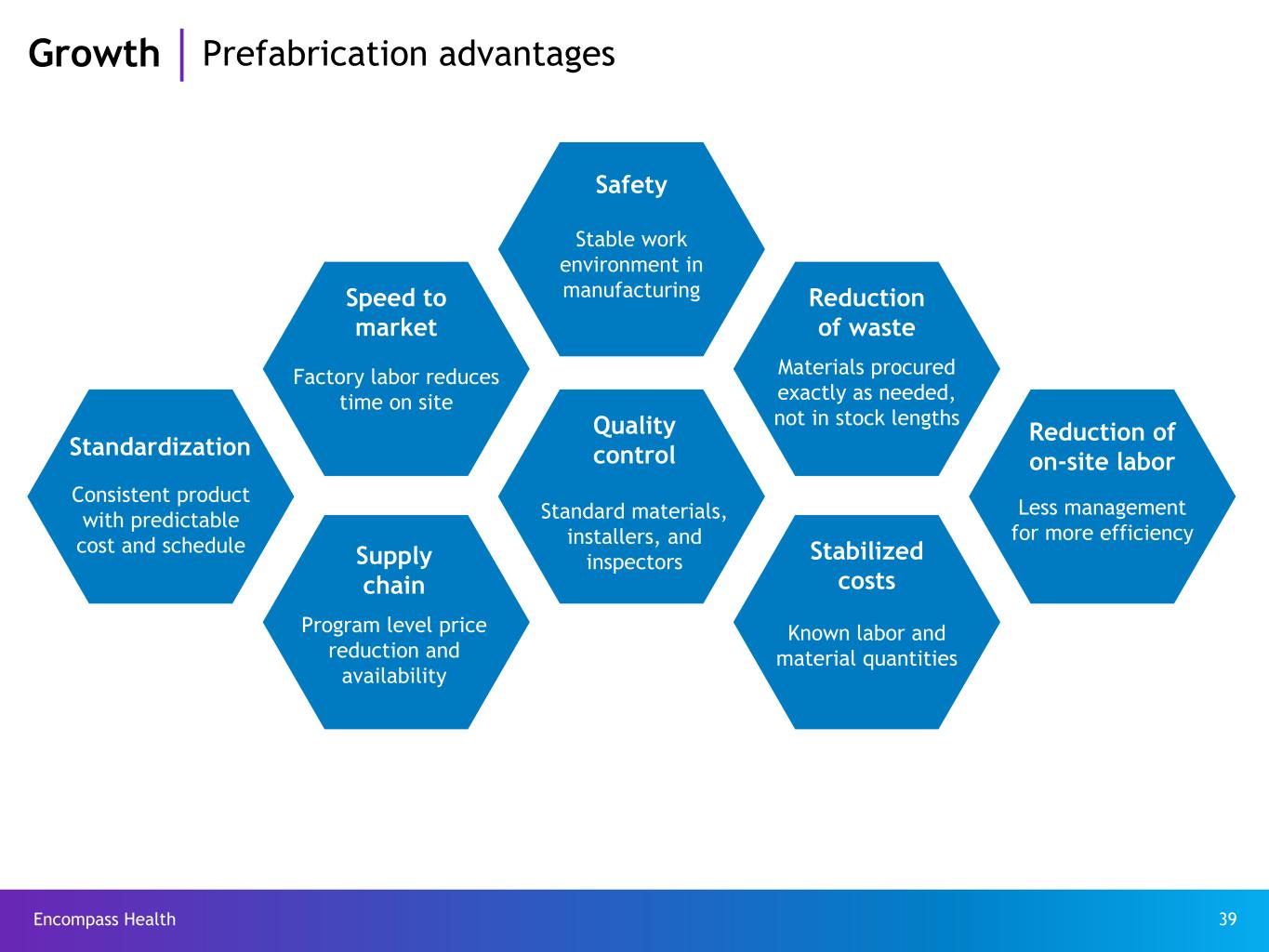 Encompass Health 39 Growth Prefabrication advantages Safety Stable work environment in manufacturing Reduction of waste Materials procured exactly as needed, not in stock lengths Reduction of on-site labor Less management for more efficiency Stabilized costs Known labor and material quantities Quality control Standard materials, installers, and inspectors Speed to market Factory labor reduces time on site Standardization Consistent product with predictable cost and schedule Supply chain Program level price reduction and availability
