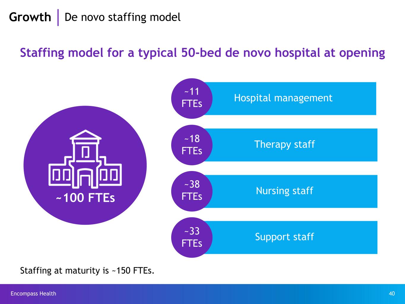 Encompass Health 40 Hospital management Therapy staff Nursing staff Support staff Growth De novo staffing model Staffing model for a typical 50-bed de novo hospital at opening ~100 FTEs ~11 FTEs ~18 FTEs ~38 FTEs ~33 FTEs Staffing at maturity is ~150 FTEs.