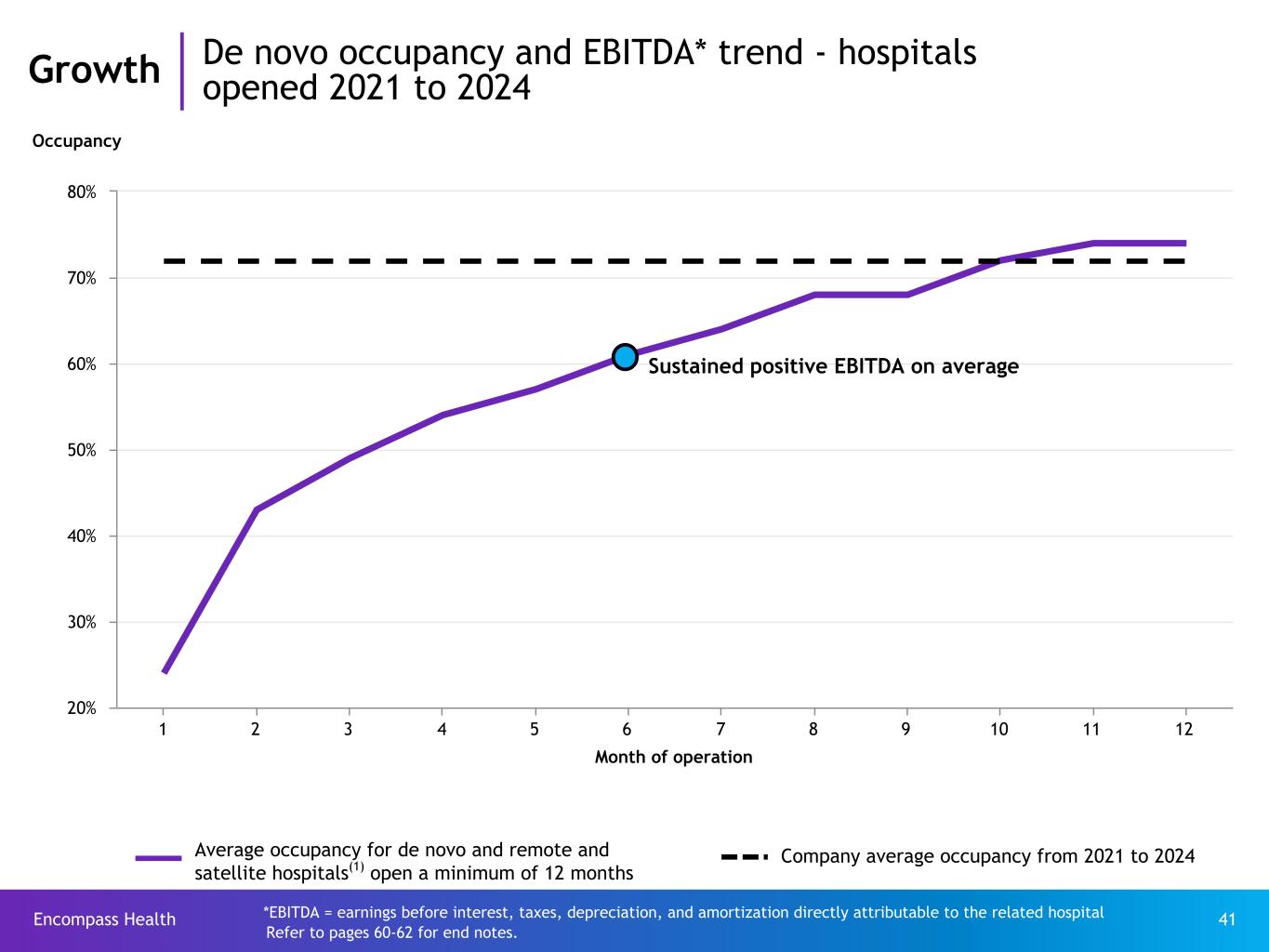 Encompass Health 41 Month of operation 1 2 3 4 5 6 7 8 9 10 11 12 20% 30% 40% 50% 60% 70% 80% Occupancy Sustained positive EBITDA on average *EBITDA = earnings before interest, taxes, depreciation, and amortization directly attributable to the related hospital Growth De novo occupancy and EBITDA* trend - hospitals opened 2021 to 2024 Average occupancy for de novo and remote and satellite hospitals(1) open a minimum of 12 months Company average occupancy from 2021 to 2024 Refer to pages 60-62 for end notes.
