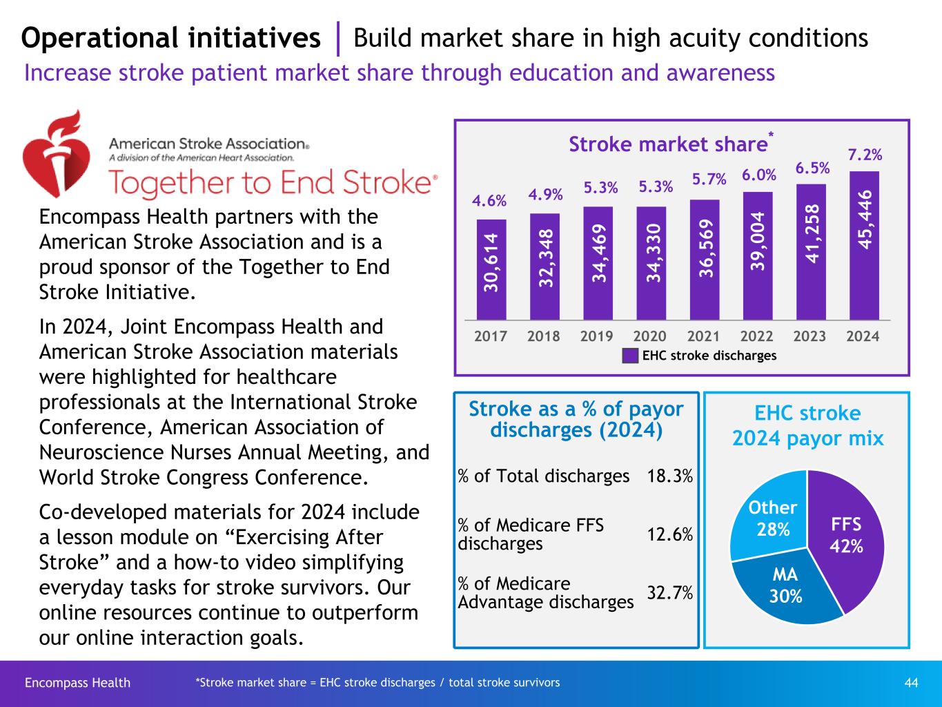 Encompass Health 44 Operational initiatives Build market share in high acuity conditions Increase stroke patient market share through education and awareness 2017 2018 2019 2020 2021 2022 2023 2024 30 ,6 14 32 ,3 48 34 ,4 69 34 ,3 30 36 ,5 69 39 ,0 04 EHC stroke discharges Stroke market share* Stroke as a % of payor discharges (2024) % of Total discharges 18.3% % of Medicare FFS discharges 12.6% % of Medicare Advantage discharges 32.7% 4.6% 4.9% 5.3% 5.3% 5.7% 6.0% EHC stroke 2024 payor mix FFS 42% MA 30% Other 28% *Stroke market share = EHC stroke discharges / total stroke survivors 41 ,2 58 6.5% Encompass Health partners with the American Stroke Association and is a proud sponsor of the Together to End Stroke Initiative. In 2024, Joint Encompass Health and American Stroke Association materials were highlighted for healthcare professionals at the International Stroke Conference, American Association of Neuroscience Nurses Annual Meeting, and World Stroke Congress Conference. Co-developed materials for 2024 include a lesson module on “Exercising After Stroke” and a how-to video simplifying everyday tasks for stroke survivors. Our online resources continue to outperform our online interaction goals. 7.2% 45 ,4 46