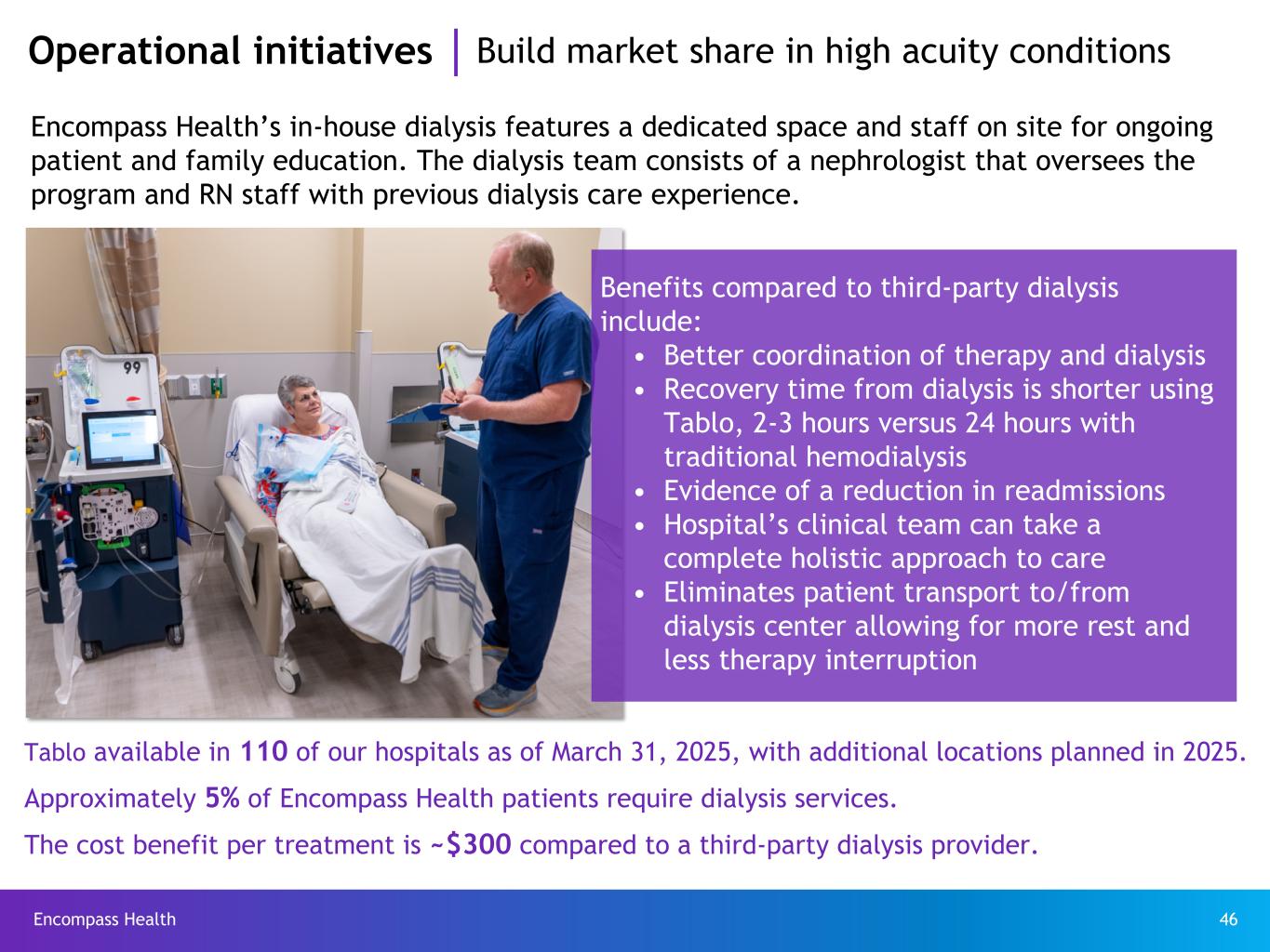 Encompass Health 46 Operational initiatives Build market share in high acuity conditions Tablo available in 110 of our hospitals as of March 31, 2025, with additional locations planned in 2025. Approximately 5% of Encompass Health patients require dialysis services. The cost benefit per treatment is ~$300 compared to a third-party dialysis provider. Encompass Health’s in-house dialysis features a dedicated space and staff on site for ongoing patient and family education. The dialysis team consists of a nephrologist that oversees the program and RN staff with previous dialysis care experience. Benefits compared to third-party dialysis include: • Better coordination of therapy and dialysis • Recovery time from dialysis is shorter using Tablo, 2-3 hours versus 24 hours with traditional hemodialysis • Evidence of a reduction in readmissions • Hospital’s clinical team can take a complete holistic approach to care • Eliminates patient transport to/from dialysis center allowing for more rest and less therapy interruption
