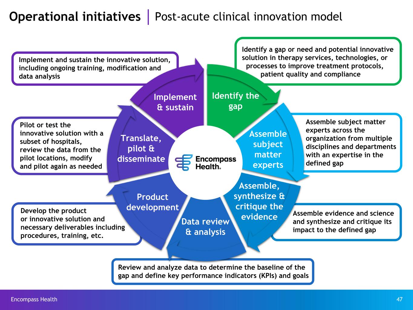 Encompass Health 47 Operational initiatives Post-acute clinical innovation model Identify the gap Assemble subject matter experts Assemble, synthesize & critique the evidenceData review & analysis Product development Translate, pilot & disseminate Implement & sustain Identify a gap or need and potential innovative solution in therapy services, technologies, or processes to improve treatment protocols, patient quality and compliance Assemble subject matter experts across the organization from multiple disciplines and departments with an expertise in the defined gap Assemble evidence and science and synthesize and critique its impact to the defined gap Review and analyze data to determine the baseline of the gap and define key performance indicators (KPIs) and goals Develop the product or innovative solution and necessary deliverables including procedures, training, etc. Pilot or test the innovative solution with a subset of hospitals, review the data from the pilot locations, modify and pilot again as needed Implement and sustain the innovative solution, including ongoing training, modification and data analysis