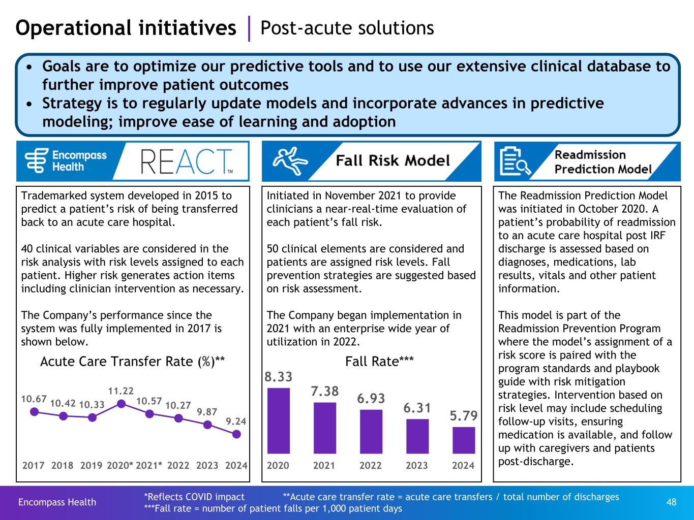 Encompass Health 48 Trademarked system developed in 2015 to predict a patient’s risk of being transferred back to an acute care hospital. 40 clinical variables are considered in the risk analysis with risk levels assigned to each patient. Higher risk generates action items including clinician intervention as necessary. The Company’s performance since the system was fully implemented in 2017 is shown below. Operational initiatives Post-acute solutions Initiated in November 2021 to provide clinicians a near-real-time evaluation of each patient’s fall risk. 50 clinical elements are considered and patients are assigned risk levels. Fall prevention strategies are suggested based on risk assessment. The Company began implementation in 2021 with an enterprise wide year of utilization in 2022. The Readmission Prediction Model was initiated in October 2020. A patient’s probability of readmission to an acute care hospital post IRF discharge is assessed based on diagnoses, medications, lab results, vitals and other patient information. This model is part of the Readmission Prevention Program where the model’s assignment of a risk score is paired with the program standards and playbook guide with risk mitigation strategies. Intervention based on risk level may include scheduling follow-up visits, ensuring medication is available, and follow up with caregivers and patients post-discharge. *Reflects COVID impact **Acute care transfer rate = acute care transfers / total number of discharges ***Fall rate = number of patient falls per 1,000 patient days • Goals are to optimize our predictive tools and to use our extensive clinical database to further improve patient outcomes • Strategy is to regularly update models and incorporate advances in predictive modeling; improve ease of learning and adoption Acute Care Transfer Rate (%)** Fall Rate*** 8.33 7.38 6.93 6.31 5.79 2020 2021 2022 2023 2024 10.67 10.42 10.33 11.22 10.57 10.27 9.87 9.24 2017 2018 2019 2020* 2021* 2022 2023 2024