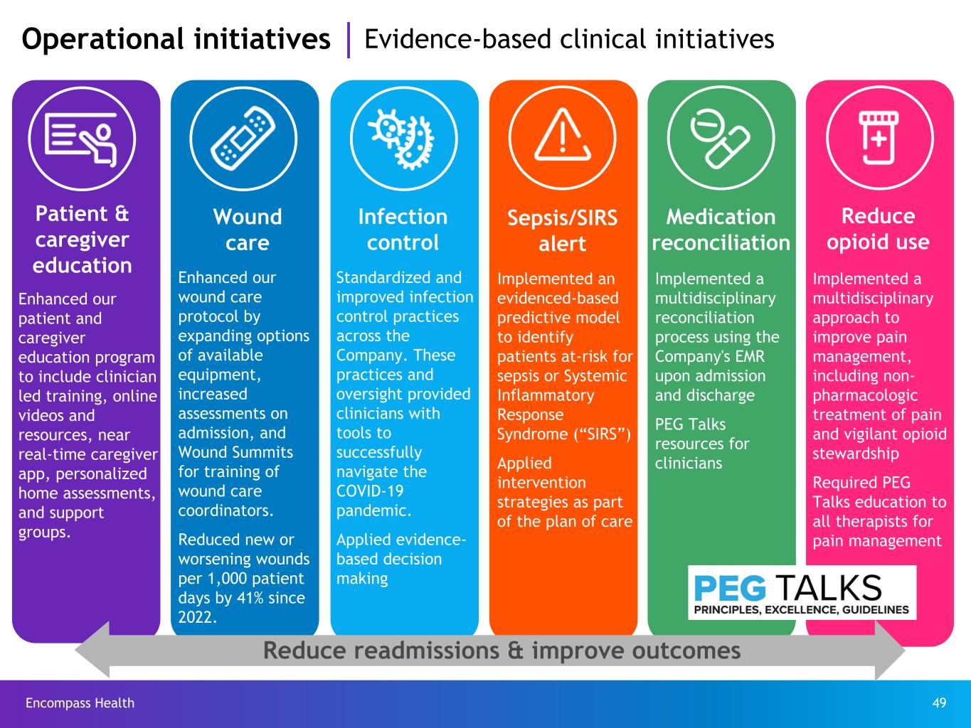 Encompass Health 49 Standardized and improved infection control practices across the Company. These practices and oversight provided clinicians with tools to successfully navigate the COVID-19 pandemic. Applied evidence- based decision making Sepsis/SIRS alert Infection control Implemented an evidenced-based predictive model to identify patients at-risk for sepsis or Systemic Inflammatory Response Syndrome (“SIRS”) Applied intervention strategies as part of the plan of care Medication reconciliation Implemented a multidisciplinary reconciliation process using the Company's EMR upon admission and discharge PEG Talks resources for clinicians Reduce opioid use Implemented a multidisciplinary approach to improve pain management, including non- pharmacologic treatment of pain and vigilant opioid stewardship Required PEG Talks education to all therapists for pain management Reduce readmissions & improve outcomes Operational initiatives Evidence-based clinical initiatives Enhanced our wound care protocol by expanding options of available equipment, increased assessments on admission, and Wound Summits for training of wound care coordinators. Reduced new or worsening wounds per 1,000 patient days by 41% since 2022. Wound care Enhanced our patient and caregiver education program to include clinician led training, online videos and resources, near real-time caregiver app, personalized home assessments, and support groups. Patient & caregiver education