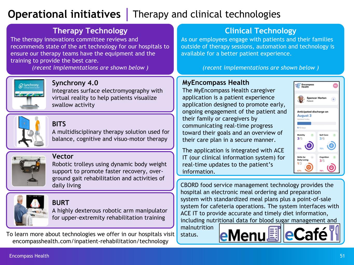 Encompass Health 51 Operational initiatives Therapy and clinical technologies Therapy Technology The therapy innovations committee reviews and recommends state of the art technology for our hospitals to ensure our therapy teams have the equipment and the training to provide the best care. (recent implementations are shown below ) Clinical Technology As our employees engage with patients and their families outside of therapy sessions, automation and technology is available for a better patient experience. (recent implementations are shown below ) Synchrony 4.0 Integrates surface electromyography with virtual reality to help patients visualize swallow activity BITS A multidisciplinary therapy solution used for balance, cognitive and visuo-motor therapy Vector Robotic trolleys using dynamic body weight support to promote faster recovery, over- ground gait rehabilitation and activities of daily living BURT A highly dexterous robotic arm manipulator for upper-extremity rehabilitation training MyEncompass Health The MyEncompass Health caregiver application is a patient experience application designed to promote early, ongoing engagement of the patient and their family or caregivers by communicating real-time progress toward their goals and an overview of their care plan in a secure manner. The application is integrated with ACE IT (our clinical information system) for real-time updates to the patient’s information. CBORD food service management technology provides the hospital an electronic meal ordering and preparation system with standardized meal plans plus a point-of-sale system for cafeteria operations. The system interfaces with ACE IT to provide accurate and timely diet information, including nutritional data for blood sugar management and malnutrition status.To learn more about technologies we offer in our hospitals visit encompasshealth.com/inpatient-rehabilitation/technology
