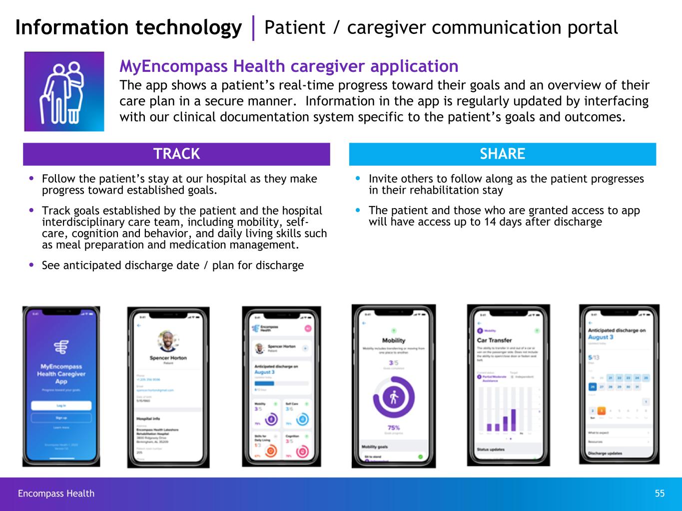 Encompass Health 55 Information technology Patient / caregiver communication portal MyEncompass Health caregiver application The app shows a patient’s real-time progress toward their goals and an overview of their care plan in a secure manner. Information in the app is regularly updated by interfacing with our clinical documentation system specific to the patient’s goals and outcomes. TRACK SHARE ● Follow the patient’s stay at our hospital as they make progress toward established goals. ● Invite others to follow along as the patient progresses in their rehabilitation stay ● Track goals established by the patient and the hospital interdisciplinary care team, including mobility, self- care, cognition and behavior, and daily living skills such as meal preparation and medication management. ● The patient and those who are granted access to app will have access up to 14 days after discharge ● See anticipated discharge date / plan for discharge