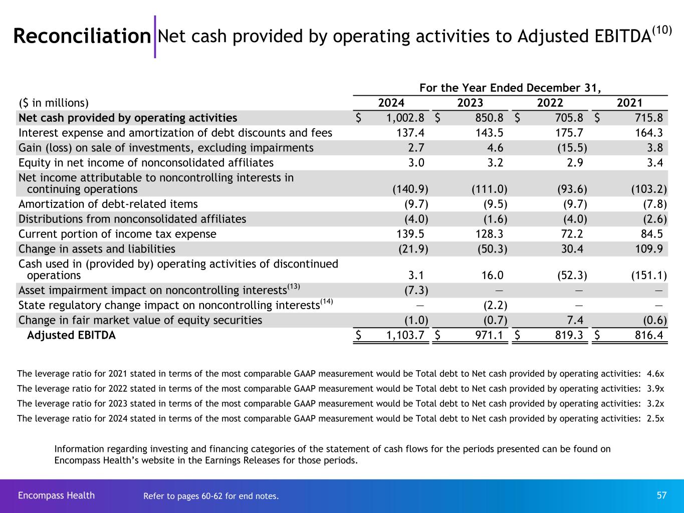 Encompass Health 57 Reconciliation Net cash provided by operating activities to Adjusted EBITDA(10) For the Year Ended December 31, ($ in millions) 2024 2023 2022 2021 Net cash provided by operating activities $ 1,002.8 $ 850.8 $ 705.8 $ 715.8 Interest expense and amortization of debt discounts and fees 137.4 143.5 175.7 164.3 Gain (loss) on sale of investments, excluding impairments 2.7 4.6 (15.5) 3.8 Equity in net income of nonconsolidated affiliates 3.0 3.2 2.9 3.4 Net income attributable to noncontrolling interests in continuing operations (140.9) (111.0) (93.6) (103.2) Amortization of debt-related items (9.7) (9.5) (9.7) (7.8) Distributions from nonconsolidated affiliates (4.0) (1.6) (4.0) (2.6) Current portion of income tax expense 139.5 128.3 72.2 84.5 Change in assets and liabilities (21.9) (50.3) 30.4 109.9 Cash used in (provided by) operating activities of discontinued operations 3.1 16.0 (52.3) (151.1) Asset impairment impact on noncontrolling interests(13) (7.3) — — — State regulatory change impact on noncontrolling interests(14) — (2.2) — — Change in fair market value of equity securities (1.0) (0.7) 7.4 (0.6) Adjusted EBITDA $ 1,103.7 $ 971.1 $ 819.3 $ 816.4 Information regarding investing and financing categories of the statement of cash flows for the periods presented can be found on Encompass Health’s website in the Earnings Releases for those periods. The leverage ratio for 2021 stated in terms of the most comparable GAAP measurement would be Total debt to Net cash provided by operating activities: 4.6x The leverage ratio for 2022 stated in terms of the most comparable GAAP measurement would be Total debt to Net cash provided by operating activities: 3.9x The leverage ratio for 2023 stated in terms of the most comparable GAAP measurement would be Total debt to Net cash provided by operating activities: 3.2x The leverage ratio for 2024 stated in terms of the most comparable GAAP measurement would be Total debt to Net cash provided by operating activities: 2.5x Refer to pages 60-62 for end notes.