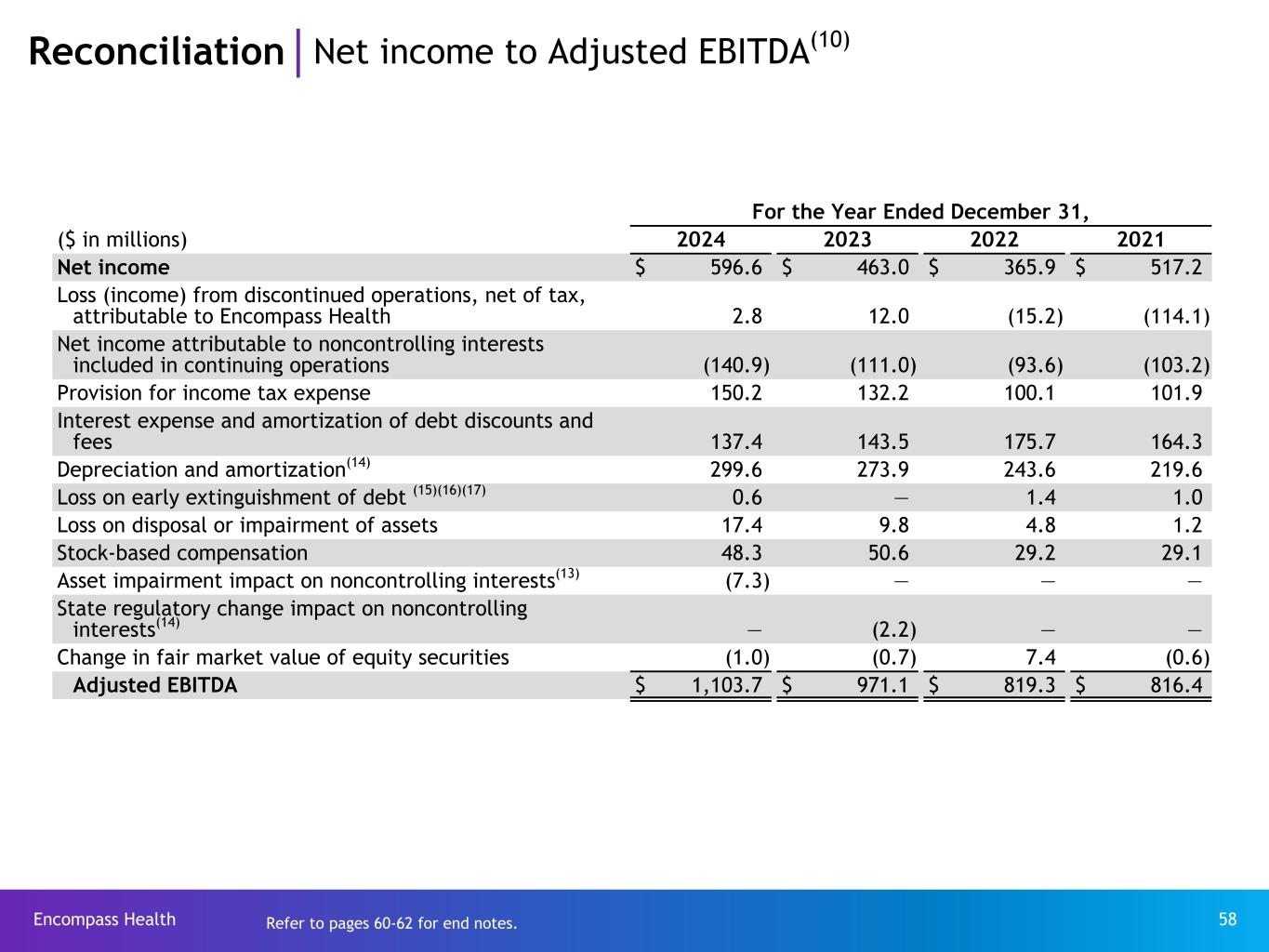 Encompass Health 58 Reconciliation Net income to Adjusted EBITDA(10) For the Year Ended December 31, ($ in millions) 2024 2023 2022 2021 Net income $ 596.6 $ 463.0 $ 365.9 $ 517.2 Loss (income) from discontinued operations, net of tax, attributable to Encompass Health 2.8 12.0 (15.2) (114.1) Net income attributable to noncontrolling interests included in continuing operations (140.9) (111.0) (93.6) (103.2) Provision for income tax expense 150.2 132.2 100.1 101.9 Interest expense and amortization of debt discounts and fees 137.4 143.5 175.7 164.3 Depreciation and amortization(14) 299.6 273.9 243.6 219.6 Loss on early extinguishment of debt (15)(16)(17) 0.6 — 1.4 1.0 Loss on disposal or impairment of assets 17.4 9.8 4.8 1.2 Stock-based compensation 48.3 50.6 29.2 29.1 Asset impairment impact on noncontrolling interests(13) (7.3) — — — State regulatory change impact on noncontrolling interests(14) — (2.2) — — Change in fair market value of equity securities (1.0) (0.7) 7.4 (0.6) Adjusted EBITDA $ 1,103.7 $ 971.1 $ 819.3 $ 816.4 Refer to pages 60-62 for end notes.