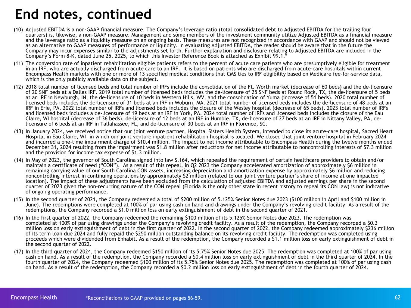 Encompass Health 62 (10) Adjusted EBITDA is a non-GAAP financial measure. The Company’s leverage ratio (total consolidated debt to Adjusted EBITDA for the trailing four quarters) is, likewise, a non-GAAP measure. Management and some members of the investment community utilize Adjusted EBITDA as a financial measure and the leverage ratio as a liquidity measure on an ongoing basis. These measures are not recognized in accordance with GAAP and should not be viewed as an alternative to GAAP measures of performance or liquidity. In evaluating Adjusted EBITDA, the reader should be aware that in the future the Company may incur expenses similar to the adjustments set forth. Further explanation and disclosure relating to Adjusted EBITDA are included in the Company’s Form 8-K, dated June 25, 2025, to which this Investor Reference Book is attached as Exhibit 99.1.* (11) The conversion rate of inpatient rehabilitation eligible patients refers to the percent of acute care patients who are presumptively eligible for treatment in an IRF, who are actually discharged from acute care to an IRF. It is based on patients who are discharged from acute-care hospitals within current Encompass Health markets with one or more of 13 specified medical conditions that CMS ties to IRF eligibility based on Medicare fee-for-service data, which is the only publicly available data on the subject. (12) 2018 total number of licensed beds and total number of IRFs include the consolidation of the Ft. Worth market (decrease of 60 beds) and the de-licensure of 20 SNF beds at a Dallas IRF. 2019 total number of licensed beds includes the de-licensure of 25 SNF beds at Round Rock, TX, the de-licensure of 5 beds at an IRF in Newburgh, IN, the de-licensure of 10 beds in Western Hills, WV, and the consolidation of Yuma (increase of 51 beds). 2020 total number of licensed beds includes the de-licensure of 31 beds at an IRF in Woburn, MA. 2021 total number of licensed beds includes the de-licensure of 48 beds at an IRF in Erie, PA. 2022 total number of IRFs and licensed beds includes the closure of the Wesley hospital (decrease of 65 beds). 2023 total number of IRFs and licensed beds includes a de-licensure of 19 beds at an IRF in York, PA. 2024 total number of IRFs and licensed beds includes the closure of the Eau Claire, WI hospital (decrease of 36 beds), de-licensure of 12 beds at an IRF in Humble, TX, de-licensure of 27 beds at an IRF in Nittany Valley, PA, de- licensure of 6 beds at an IRF in Tallahassee, FL, and de-licensure of 30 beds at an IRF in Florence, SC. (13) In January 2024, we received notice that our joint venture partner, Hospital Sisters Health System, intended to close its acute-care hospital, Sacred Heart Hospital in Eau Claire, WI, in which our joint venture inpatient rehabilitation hospital is located. We closed that joint venture hospital in February 2024 and incurred a one-time impairment charge of $10.4 million. The impact to net income attributable to Encompass Health during the twelve months ended December 31, 2024 resulting from the impairment was $1.8 million after reductions for net income attributable to noncontrolling interests of $7.3 million and the provision for income tax expense of $1.3 million. (14) In May of 2023, the governor of South Carolina signed into law S.164, which repealed the requirement of certain healthcare providers to obtain and/or maintain a certificate of need (“CON”). As a result of this repeal, in Q2 2023 the Company accelerated amortization of approximately $6 million in remaining carrying value of our South Carolina CON assets, increasing depreciation and amortization expense by approximately $6 million and reducing noncontrolling interest in continuing operations by approximately $2 million (related to our joint venture partner’s share of income at one impacted location). The impact of these adjustments have been excluded from the calculation of adjusted EBITDA and adjusted earnings per share in the second quarter of 2023 given the non-recurring nature of the CON repeal (Florida is the only other state in recent history to repeal its CON law) is not indicative of ongoing operating performance. (15) In the second quarter of 2021, the Company redeemed a total of $200 million of 5.125% Senior Notes due 2023 ($100 million in April and $100 million in June). The redemptions were completed at 100% of par using cash on hand and drawings under the Company’s revolving credit facility. As a result of the redemptions, the Company recorded a $1.0 million loss on early extinguishment of debt in the second quarter of 2021. (16) In the first quarter of 2022, the Company redeemed the remaining $100 million of its 5.125% Senior Notes due 2023. The redemption was completed at 100% of par using drawings under the Company’s revolving credit facility. As a result of the redemption, the Company recorded a $0.3 million loss on early extinguishment of debt in the first quarter of 2022. In the second quarter of 2022, the Company redeemed approximately $236 million of its term loan due 2024 and fully repaid the $250 million outstanding balance on its revolving credit facility. The redemption was completed using proceeds which were dividended from Enhabit. As a result of the redemption, the Company recorded a $1.1 million loss on early extinguishment of debt in the second quarter of 2022. (17) In the third quarter of 2024, the Company redeemed $150 million of its 5.75% Senior Notes due 2025. The redemption was completed at 100% of par using cash on hand. As a result of the redemption, the Company recorded a $0.4 million loss on early extinguishment of debt in the third quarter of 2024. In the fourth quarter of 2024, the Company redeemed $100 million of its 5.75% Senior Notes due 2025. The redemption was completed at 100% of par using cash on hand. As a result of the redemption, the Company recorded a $0.2 million loss on early extinguishment of debt in the fourth quarter of 2024. End no