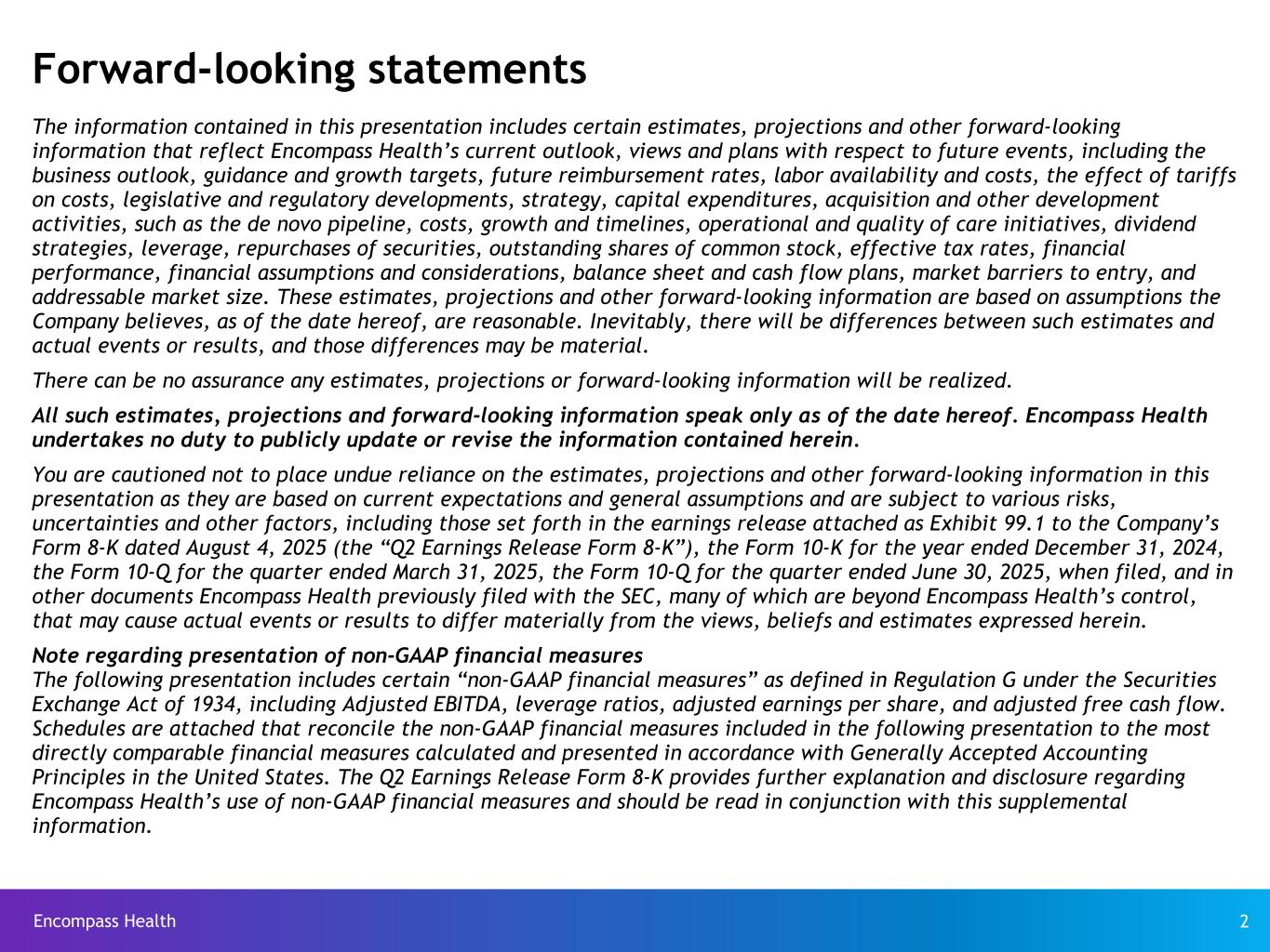 Encompass Health 2 The information contained in this presentation includes certain estimates, projections and other forward-looking information that reflect Encompass Health’s current outlook, views and plans with respect to future events, including the business outlook, guidance and growth targets, future reimbursement rates, labor availability and costs, the effect of tariffs on costs, legislative and regulatory developments, strategy, capital expenditures, acquisition and other development activities, such as the de novo pipeline, costs, growth and timelines, operational and quality of care initiatives, dividend strategies, leverage, repurchases of securities, outstanding shares of common stock, effective tax rates, financial performance, financial assumptions and considerations, balance sheet and cash flow plans, market barriers to entry, and addressable market size. These estimates, projections and other forward-looking information are based on assumptions the Company believes, as of the date hereof, are reasonable. Inevitably, there will be differences between such estimates and actual events or results, and those differences may be material. There can be no assurance any estimates, projections or forward-looking information will be realized. All such estimates, projections and forward-looking information speak only as of the date hereof. Encompass Health undertakes no duty to publicly update or revise the information contained herein. You are cautioned not to place undue reliance on the estimates, projections and other forward-looking information in this presentation as they are based on current expectations and general assumptions and are subject to various risks, uncertainties and other factors, including those set forth in the earnings release attached as Exhibit 99.1 to the Company’s Form 8-K dated August 4, 2025 (the “Q2 Earnings Release Form 8-K”), the Form 10-K for the year ended December 31, 2024, the Form 10-Q for the quarter ended March 31, 2025, the Form 10-Q for the quarter ended June 30, 2025, when filed, and in other documents Encompass Health previously filed with the SEC, many of which are beyond Encompass Health’s control, that may cause actual events or results to differ materially from the views, beliefs and estimates expressed herein. Note regarding presentation of non-GAAP financial measures The following presentation includes certain “non-GAAP financial measures” as defined in Regulation G under the Securities Exchange Act of 1934, including Adjusted EBITDA, leverage ratios, adjusted earnings per share, and adjusted free cash flow. Schedules are attached that reconcile the non-GAAP financial measures included in the following presentation to the most directly comparable financial measures calculated and presented in accordance with Generally Accepted Accounting Principles in the United States. The Q2 Earnings Release Form 8-K provides further explanation and disclosure regarding Encompass Health’s use of non-GAAP financial measures and should be read in conjunction with this supplemental information. Forward-looking statements
