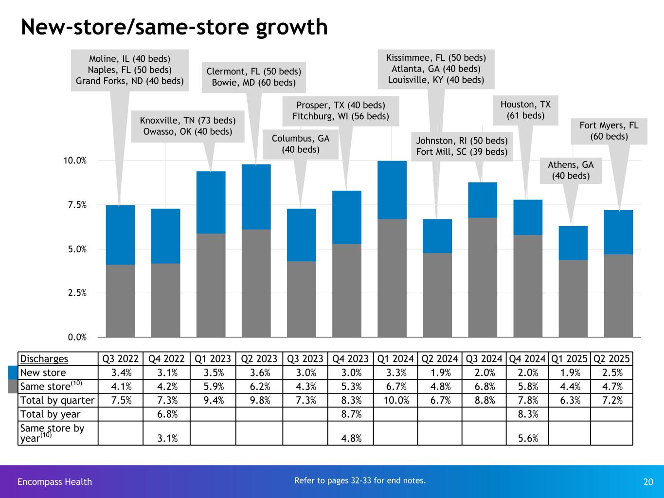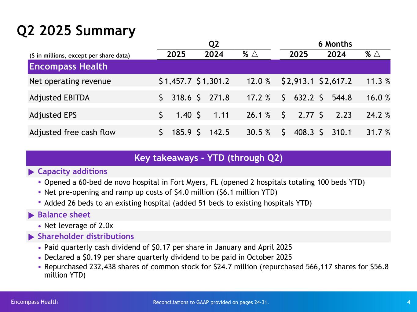Encompass Health 33 End notes (continued) (7) Our inpatient rehabilitation hospitals (“IRFs”) may operate one or more satellite and/or remote locations. Satellite and remote locations are located proximate to one of our existing IRFs but do not have a separate Medicare provider number. As such, they are considered a bed addition, are included in same store results from the day of opening, and are not included in our count of total open hospitals. As of June 30, 2025, we operated 10 satellite and remote locations. (8) Cash used for net debt redemptions were $42.3 million and $242.1 million during the six months ended June 30, 2025 and twelve months ended December 31, 2024, respectively. (9) On October 28, 2013, the Company announced its board of directors authorized the repurchase of up to $200 million of its common stock. On February 14, 2014, the Company's board approved an increase in this common stock repurchase authorization from $200 million to $250 million. As of June 30, 2018, the remaining repurchase authorization was approximately $58 million. On July 24, 2018, the Company's board approved resetting the aggregate common stock repurchase authorization to $250 million. As of June 30, 2024, the remaining repurchase authorization was approximately $181 million. On July 24, 2024, the Company’s board approved resetting the aggregate common stock repurchase authorization to $500 million. As of June 30, 2025, the remaining repurchase authorization was approximately $433 million. (10) Same-store comparisons are calculated based on hospitals open throughout both the full current periods and prior periods presented. These comparisons include the financial results of market consolidation transactions and capacity expansions (including the addition of satellite and remote hospitals) in existing markets. (11) Represents discharges from 168 consolidated hospitals in Q2 2025; 167 consolidated hospitals in Q1 2025; 166 consolidated hospitals in Q4 2024; 165 consolidated hospitals in Q3 2024; 163 consolidated hospitals in Q2 2024; 160 consolidated hospitals in Q1 2024. (12) Total full-time equivalents included in the table represent Encompass Health employees who participate in or support the operations of our hospitals and include full-time equivalents related to contract labor. (13) Employees per occupied bed, or “EPOB,” is calculated by dividing the number of total full-time equivalents, including full-time equivalents from the utilization of contract labor, by the number of occupied beds during each period. (14) In the third quarter of 2024, the Company redeemed $150 million of its 5.75% Senior Notes due 2025. The redemption was completed at 100% of par using cash on hand. As a result of the redemption, the Company recorded a $0.4 million loss on early extinguishment of debt in the third quarter of 2024. (15) In the fourth quarter of 2024, the Company redeemed $100 million of its 5.75% Senior Notes due 2025. The redemption was completed at 100% of par using cash on hand. As a result of the redemption, the Company recorded a $0.2 million loss on early extinguishment of debt in the fourth quarter of 2024. Reconciliations to GAAP provided on pages 24-31.