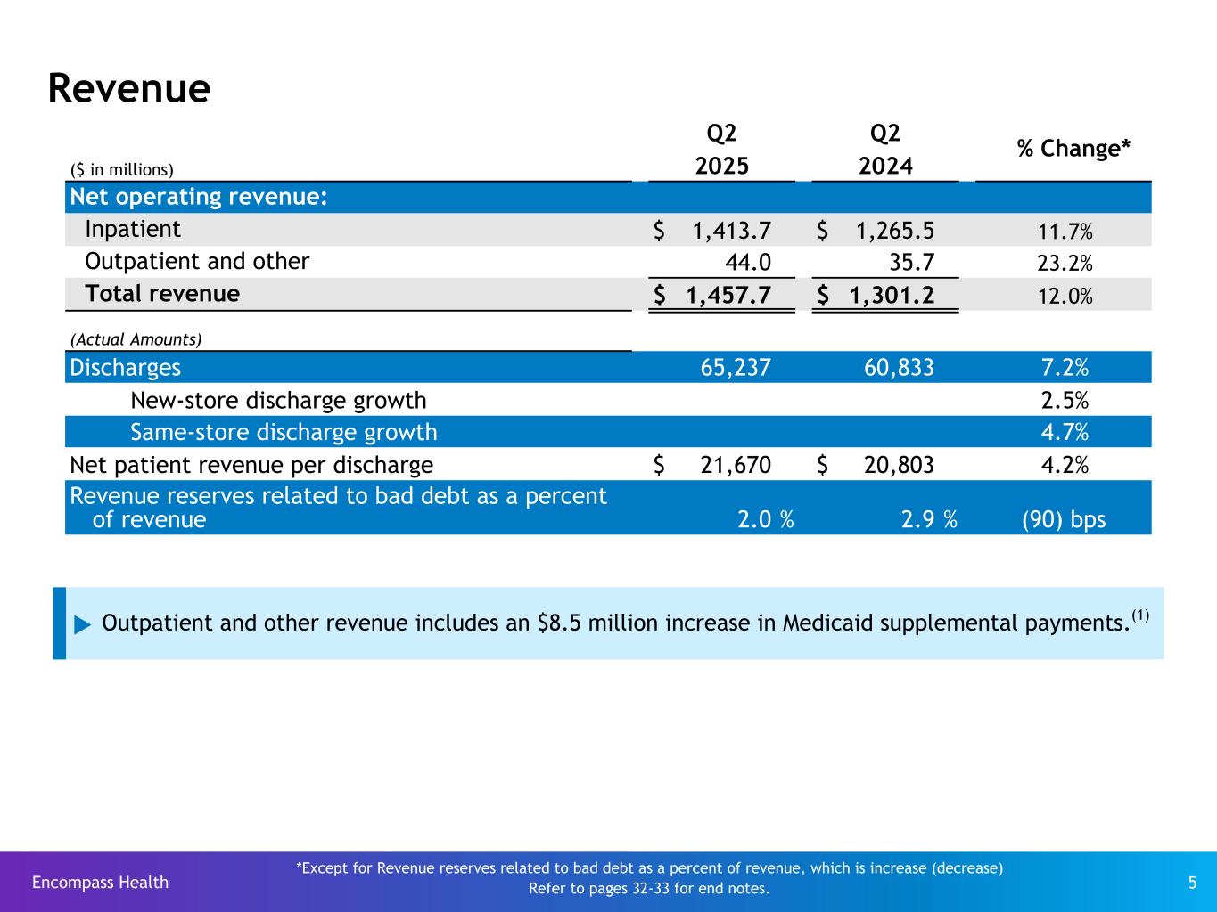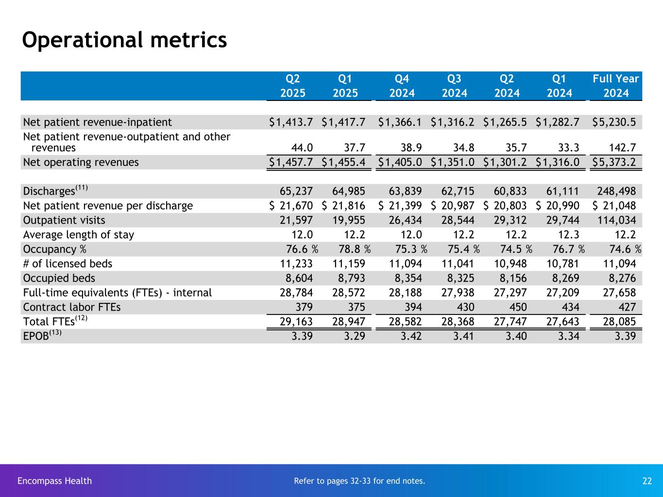 Encompass Health 22 Operational metrics Q2 Q1 Q4 Q3 Q2 Q1 Full Year 2025 2025 2024 2024 2024 2024 2024 Net patient revenue-inpatient $ 1,413.7 $ 1,417.7 $ 1,366.1 $ 1,316.2 $ 1,265.5 $ 1,282.7 $ 5,230.5 Net patient revenue-outpatient and other revenues 44.0 37.7 38.9 34.8 35.7 33.3 142.7 Net operating revenues $ 1,457.7 $ 1,455.4 $ 1,405.0 $ 1,351.0 $ 1,301.2 $ 1,316.0 $ 5,373.2 Discharges(11) 65,237 64,985 63,839 62,715 60,833 61,111 248,498 Net patient revenue per discharge $ 21,670 $ 21,816 $ 21,399 $ 20,987 $ 20,803 $ 20,990 $ 21,048 Outpatient visits 21,597 19,955 26,434 28,544 29,312 29,744 114,034 Average length of stay 12.0 12.2 12.0 12.2 12.2 12.3 12.2 Occupancy % 76.6 % 78.8 % 75.3 % 75.4 % 74.5 % 76.7 % 74.6 % # of licensed beds 11,233 11,159 11,094 11,041 10,948 10,781 11,094 Occupied beds 8,604 8,793 8,354 8,325 8,156 8,269 8,276 Full-time equivalents (FTEs) - internal 28,784 28,572 28,188 27,938 27,297 27,209 27,658 Contract labor FTEs 379 375 394 430 450 434 427 Total FTEs(12) 29,163 28,947 28,582 28,368 27,747 27,643 28,085 EPOB(13) 3.39 3.29 3.42 3.41 3.40 3.34 3.39 Refer to pages 32-33 for end notes.
