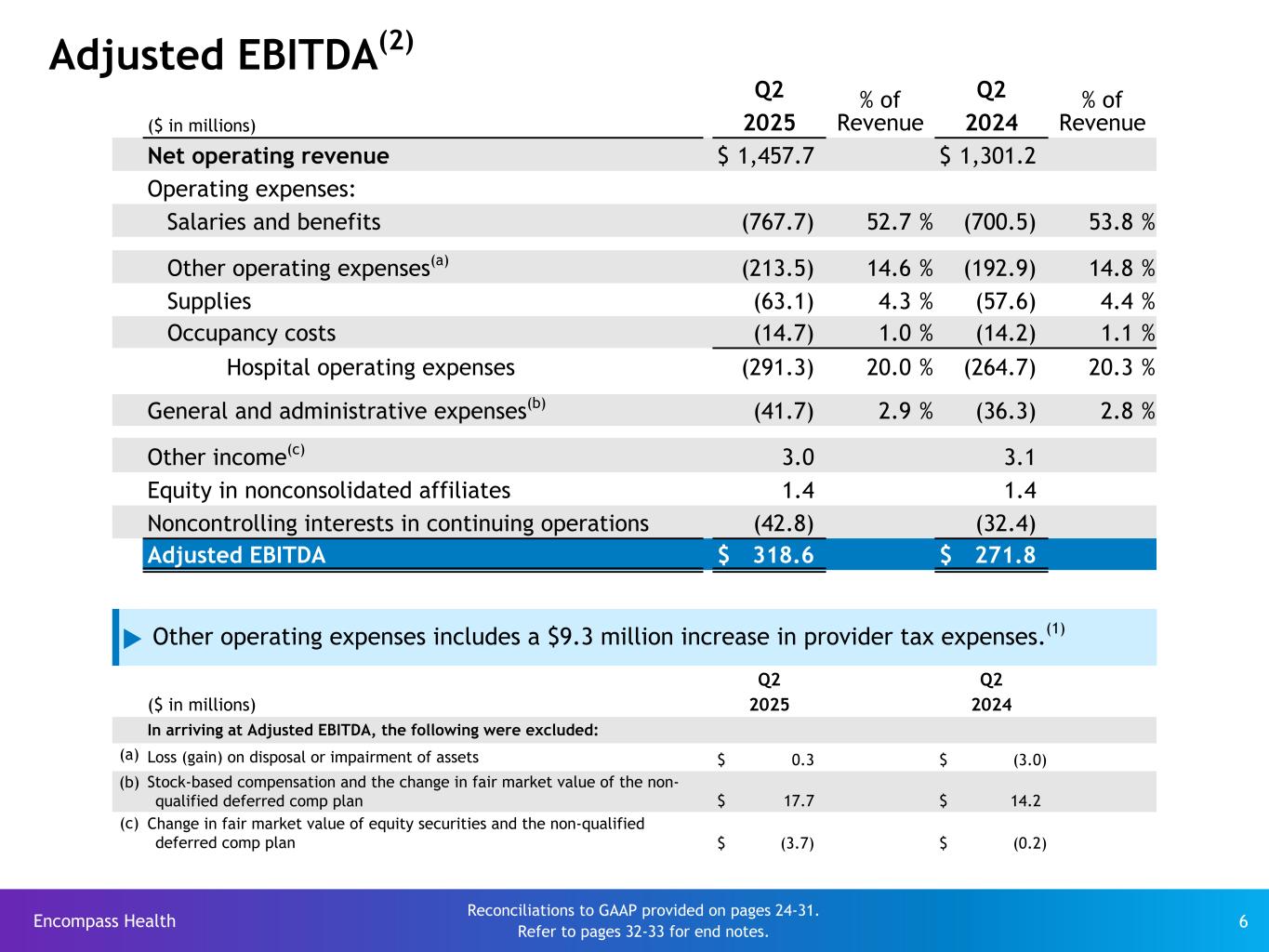 Encompass Health 6 Adjusted EBITDA(2) Q2 % of Revenue Q2 % of Revenue($ in millions) 2025 2024 Net operating revenue $ 1,457.7 $ 1,301.2 Operating expenses: Salaries and benefits (767.7) 52.7 % (700.5) 53.8 % Other operating expenses(a) (213.5) 14.6 % (192.9) 14.8 % Supplies (63.1) 4.3 % (57.6) 4.4 % Occupancy costs (14.7) 1.0 % (14.2) 1.1 % Hospital operating expenses (291.3) 20.0 % (264.7) 20.3 % General and administrative expenses(b) (41.7) 2.9 % (36.3) 2.8 % Other income(c) 3.0 3.1 Equity in nonconsolidated affiliates 1.4 1.4 Noncontrolling interests in continuing operations (42.8) (32.4) Adjusted EBITDA $ 318.6 $ 271.8 Q2 Q2 ($ in millions) 2025 2024 In arriving at Adjusted EBITDA, the following were excluded: (a) Loss (gain) on disposal or impairment of assets $ 0.3 $ (3.0) (b) Stock-based compensation and the change in fair market value of the non- qualified deferred comp plan $ 17.7 $ 14.2 (c) Change in fair market value of equity securities and the non-qualified deferred comp plan $ (3.7) $ (0.2) Reconciliations to GAAP provided on pages 24-31. Refer to pages 32-33 for end notes. u Other operating expenses includes a $9.3 million increase in provider tax expenses.(1)