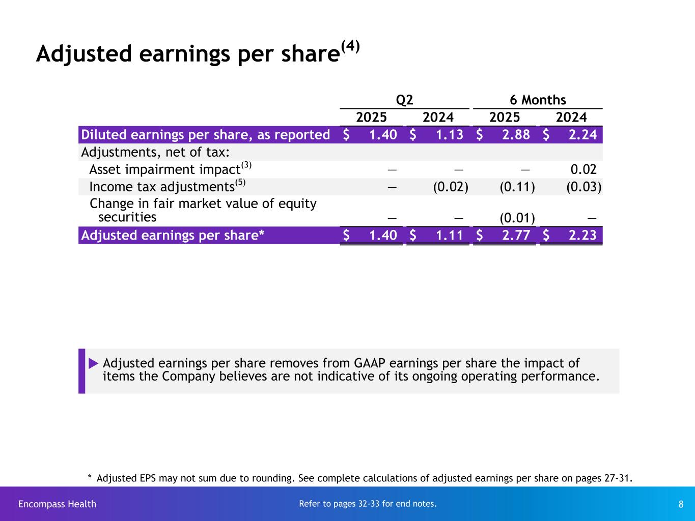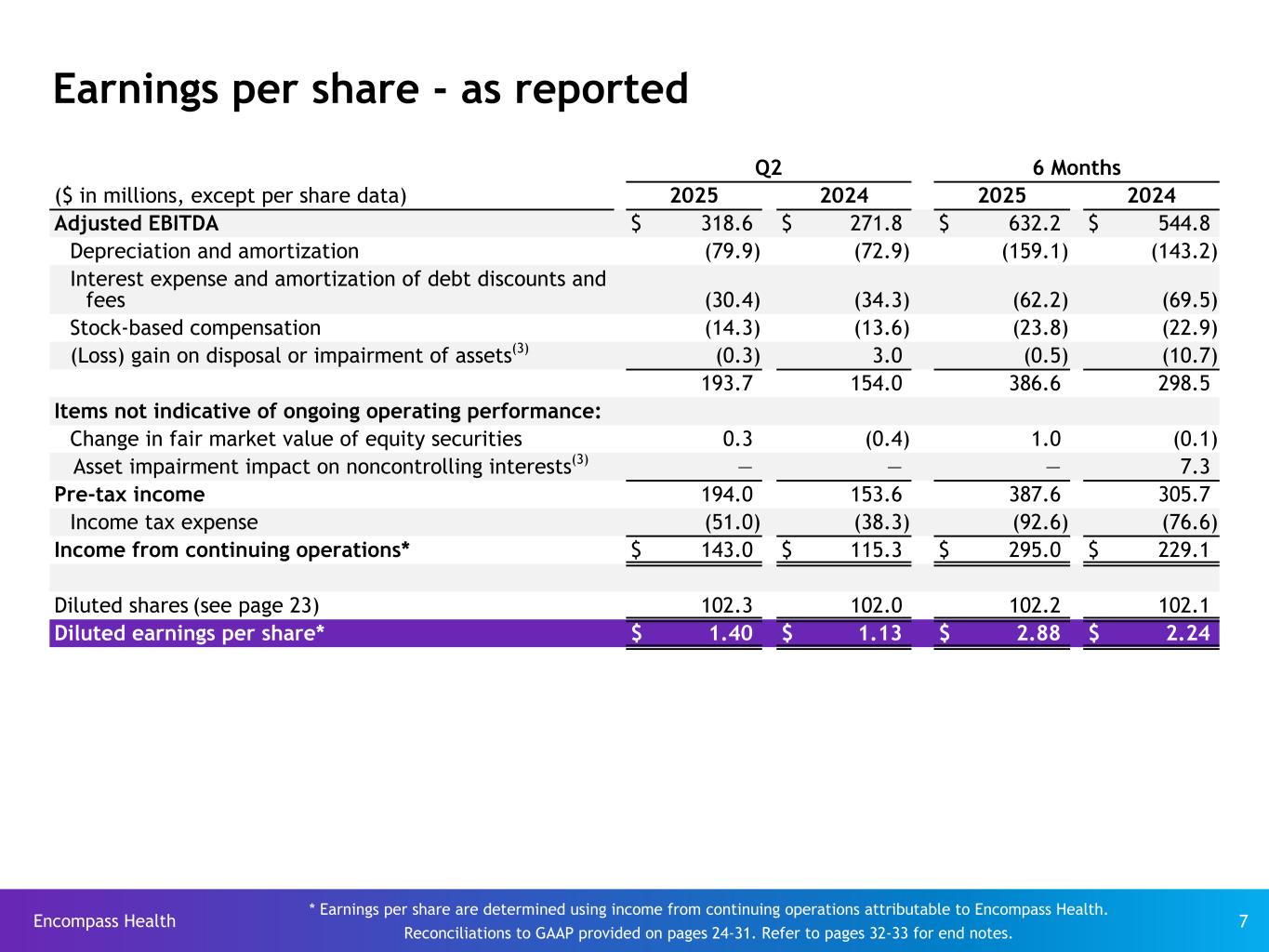 Encompass Health 7 Earnings per share - as reported Q2 6 Months ($ in millions, except per share data) 2025 2024 2025 2024 Adjusted EBITDA $ 318.6 $ 271.8 $ 632.2 $ 544.8 Depreciation and amortization (79.9) (72.9) (159.1) (143.2) Interest expense and amortization of debt discounts and fees (30.4) (34.3) (62.2) (69.5) Stock-based compensation (14.3) (13.6) (23.8) (22.9) (Loss) gain on disposal or impairment of assets(3) (0.3) 3.0 (0.5) (10.7) 193.7 154.0 386.6 298.5 Items not indicative of ongoing operating performance: Change in fair market value of equity securities 0.3 (0.4) 1.0 (0.1) Asset impairment impact on noncontrolling interests(3) — — — 7.3 Pre-tax income 194.0 153.6 387.6 305.7 Income tax expense (51.0) (38.3) (92.6) (76.6) Income from continuing operations* $ 143.0 $ 115.3 $ 295.0 $ 229.1 Diluted shares (see page 23) 102.3 102.0 102.2 102.1 Diluted earnings per share* $ 1.40 $ 1.13 $ 2.88 $ 2.24 * Earnings per share are determined using income from continuing operations attributable to Encompass Health. Reconciliations to GAAP provided on pages 24-31. Refer to pages 32-33 for end notes.