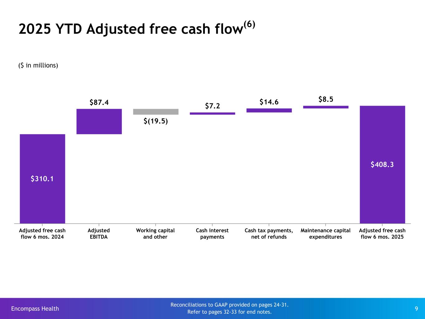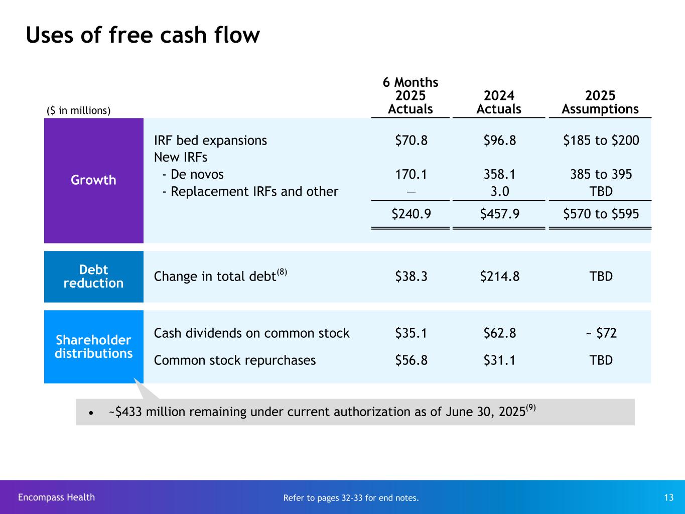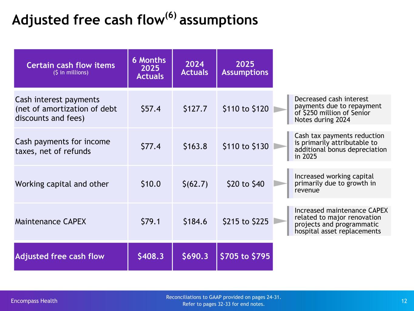 Encompass Health 12 Adjusted free cash flow(6) assumptions Certain cash flow items ($ in millions) 6 Months  2025 Actuals 2024 Actuals 2025 Assumptions Cash interest payments (net of amortization of debt discounts and fees) $57.4 $127.7 $110 to $120 Cash payments for income taxes, net of refunds $77.4 $163.8 $110 to $130 Working capital and other $10.0 $(62.7) $20 to $40 Maintenance CAPEX $79.1 $184.6 $215 to $225 Adjusted free cash flow $408.3 $690.3 $705 to $795 Increased working capital primarily due to growth in revenue Reconciliations to GAAP provided on pages 24-31. Refer to pages 32-33 for end notes. Increased maintenance CAPEX related to major renovation projects and programmatic hospital asset replacements Cash tax payments reduction is primarily attributable to additional bonus depreciation in 2025 Decreased cash interest payments due to repayment of $250 million of Senior Notes during 2024
