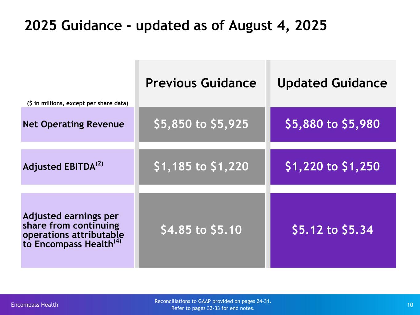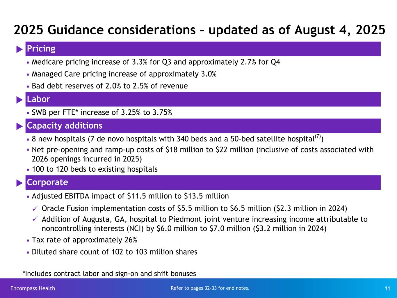Encompass Health 10 2025 Guidance - updated as of August 4, 2025 Previous Guidance Updated Guidance ($ in millions, except per share data) Net Operating Revenue $5,850 to $5,925 $5,880 to $5,980 Adjusted EBITDA(2) $1,185 to $1,220 $1,220 to $1,250 Adjusted earnings per share from continuing operations attributable to Encompass Health(4) $4.85 to $5.10 $5.12 to $5.34 Reconciliations to GAAP provided on pages 24-31. Refer to pages 32-33 for end notes.