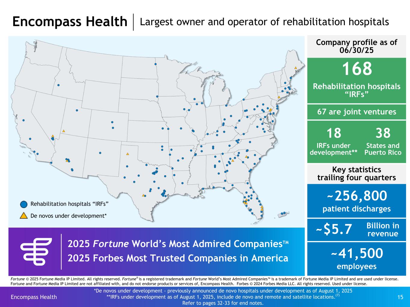 Encompass Health 15 Rehabilitation hospitals “IRFs” De novos under development* *De novos under development - previously announced de novo hospitals under development as of August 1, 2025 **IRFs under development as of August 1, 2025, include de novo and remote and satellite locations.(7) Refer to pages 32-33 for end notes. Encompass Health Largest owner and operator of rehabilitation hospitals Company profile as of 06/30/25 168 Rehabilitation hospitals “IRFs” 67 are joint ventures 18 38 IRFs under development** States and Puerto Rico Key statistics trailing four quarters ~256,800 patient discharges ~$5.7 Billion in revenue ~41,500 employees 2025 Fortune World’s Most Admired CompaniesTM 2025 Forbes Most Trusted Companies in America Fortune © 2025 Fortune Media IP Limited. All rights reserved. Fortune® is a registered trademark and Fortune World’s Most Admired Companies™ is a trademark of Fortune Media IP Limited and are used under license. Fortune and Fortune Media IP Limited are not affiliated with, and do not endorse products or services of, Encompass Health. Forbes © 2024 Forbes Media LLC. All rights reserved. Used under license.