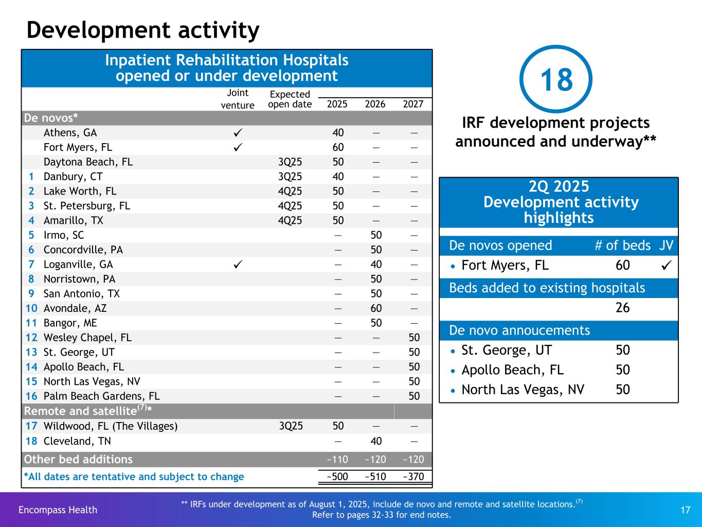 Encompass Health 17 Inpatient Rehabilitation Hospitals opened or under development Joint venture Expected open date 2025 2026 2027 De novos* Athens, GA ü 40 — — Fort Myers, FL ü 60 — — Daytona Beach, FL 3Q25 50 — — 1 Danbury, CT 3Q25 40 — — 2 Lake Worth, FL 4Q25 50 — — 3 St. Petersburg, FL 4Q25 50 — — 4 Amarillo, TX 4Q25 50 — — 5 Irmo, SC — 50 — 6 Concordville, PA — 50 — 7 Loganville, GA ü — 40 — 8 Norristown, PA — 50 — 9 San Antonio, TX — 50 — 10 Avondale, AZ — 60 — 11 Bangor, ME — 50 — 12 Wesley Chapel, FL — — 50 13 St. George, UT — — 50 14 Apollo Beach, FL — — 50 15 North Las Vegas, NV — — 50 16 Palm Beach Gardens, FL — — 50 Remote and satellite(7)* 17 Wildwood, FL (The Villages) 3Q25 50 — — 18 Cleveland, TN — 40 — Other bed additions ~110 ~120 ~120 *All dates are tentative and subject to change ~500 ~510 ~370 Development activity 2Q 2025 Development activity highlights uDe novos opened # of beds JV Ÿ Fort Myers, FL 60 ü Beds added to existing hospitals 26 De novo annoucements Ÿ St. George, UT 50 Ÿ Apollo Beach, FL 50 Ÿ North Las Vegas, NV 50 IRF development projects announced and underway** 18 ** IRFs under development as of August 1, 2025, include de novo and remote and satellite locations.(7) Refer to pages 32-33 for end notes.