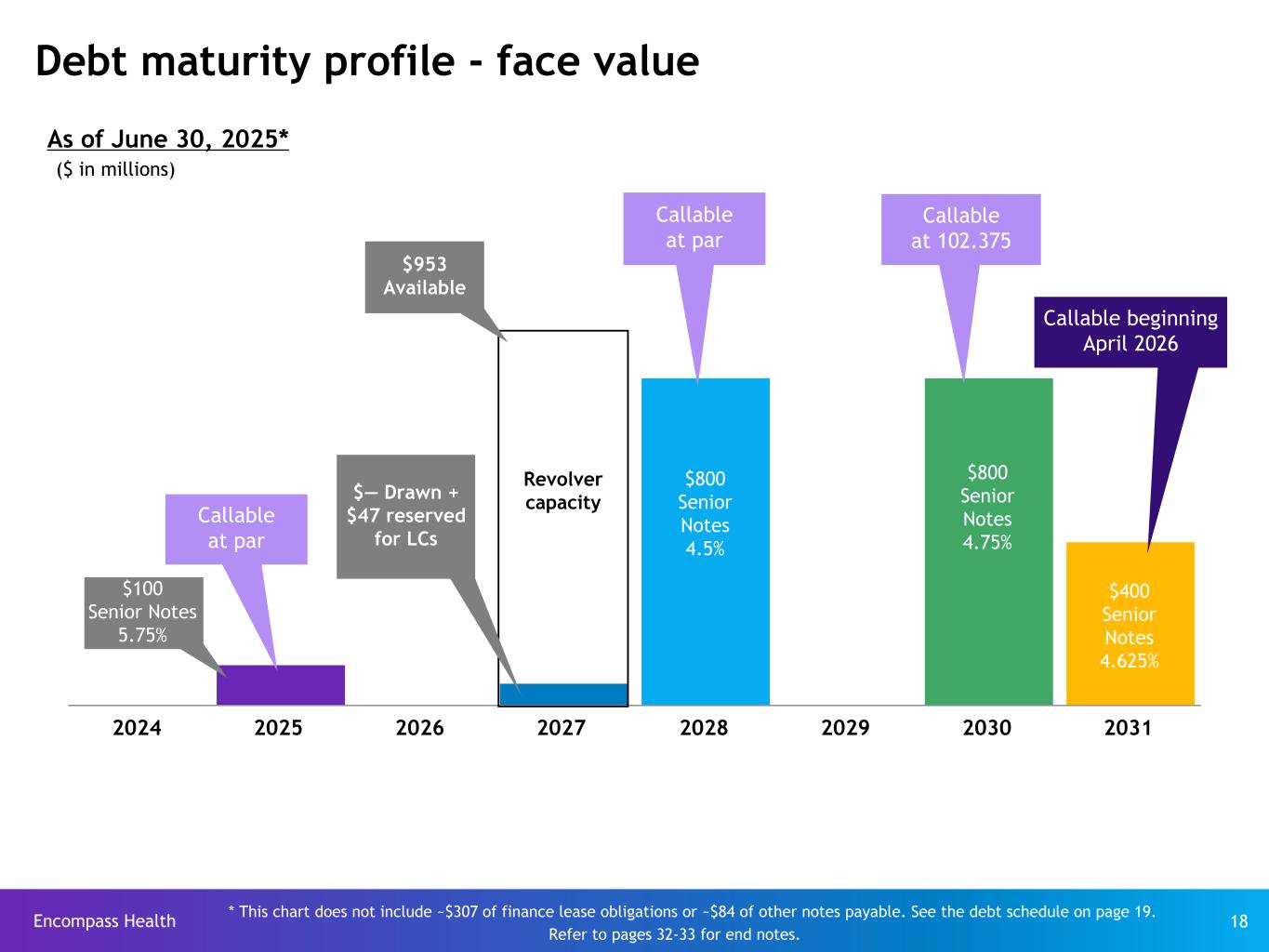 Encompass Health 18 2024 2025 2026 2027 2028 2029 2030 2031 * This chart does not include ~$307 of finance lease obligations or ~$84 of other notes payable. See the debt schedule on page 19. Debt maturity profile - face value ($ in millions) Revolver capacity $800 Senior Notes 4.75% $800 Senior Notes 4.5% As of June 30, 2025* $953 Available $— Drawn + $47 reserved for LCs Callable at par Callable at par $400 Senior Notes 4.625% Callable beginning April 2026 $100 Senior Notes 5.75% Callable at 102.375 Refer to pages 32-33 for end notes.