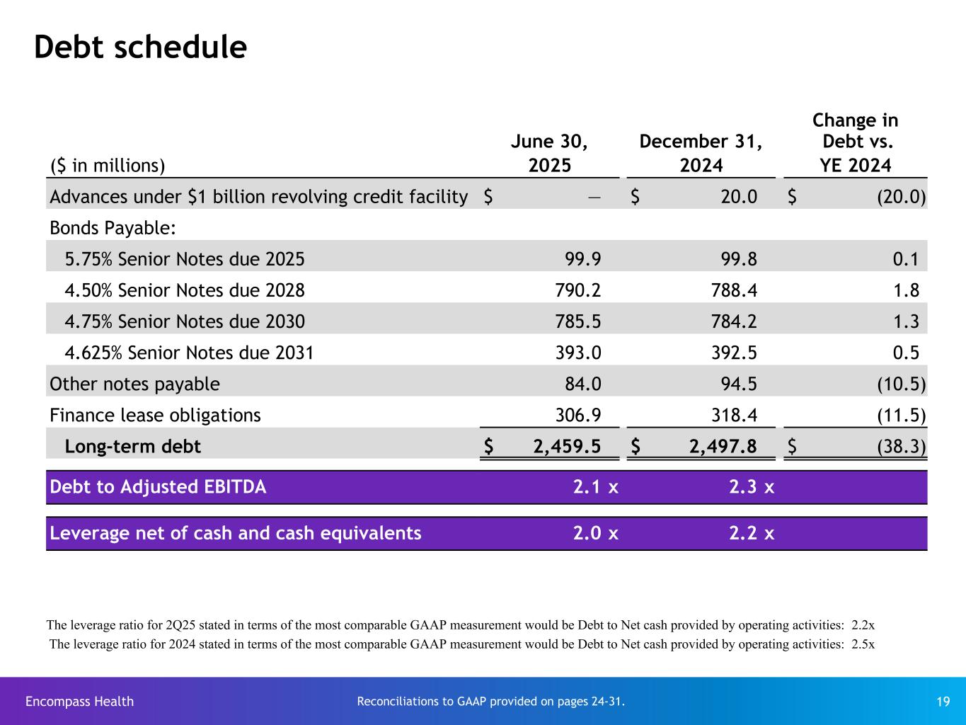 Encompass Health 19 Debt schedule Change in June 30, December 31, Debt vs. ($ in millions) 2025 2024 YE 2024 Advances under $1 billion revolving credit facility $ — $ 20.0 $ (20.0) Bonds Payable: 5.75% Senior Notes due 2025 99.9 99.8 0.1 4.50% Senior Notes due 2028 790.2 788.4 1.8 4.75% Senior Notes due 2030 785.5 784.2 1.3 4.625% Senior Notes due 2031 393.0 392.5 0.5 Other notes payable 84.0 94.5 (10.5) Finance lease obligations 306.9 318.4 (11.5) Long-term debt $ 2,459.5 $ 2,497.8 $ (38.3) Debt to Adjusted EBITDA 2.1 x 2.3 x Leverage net of cash and cash equivalents 2.0 x 2.2 x Reconciliations to GAAP provided on pages 24-31. The leverage ratio for 2Q25 stated in terms of the most comparable GAAP measurement would be Debt to Net cash provided by operating activities: 2.2x The leverage ratio for 2024 stated in terms of the most comparable GAAP measurement would be Debt to Net cash provided by operating activities: 2.5x
