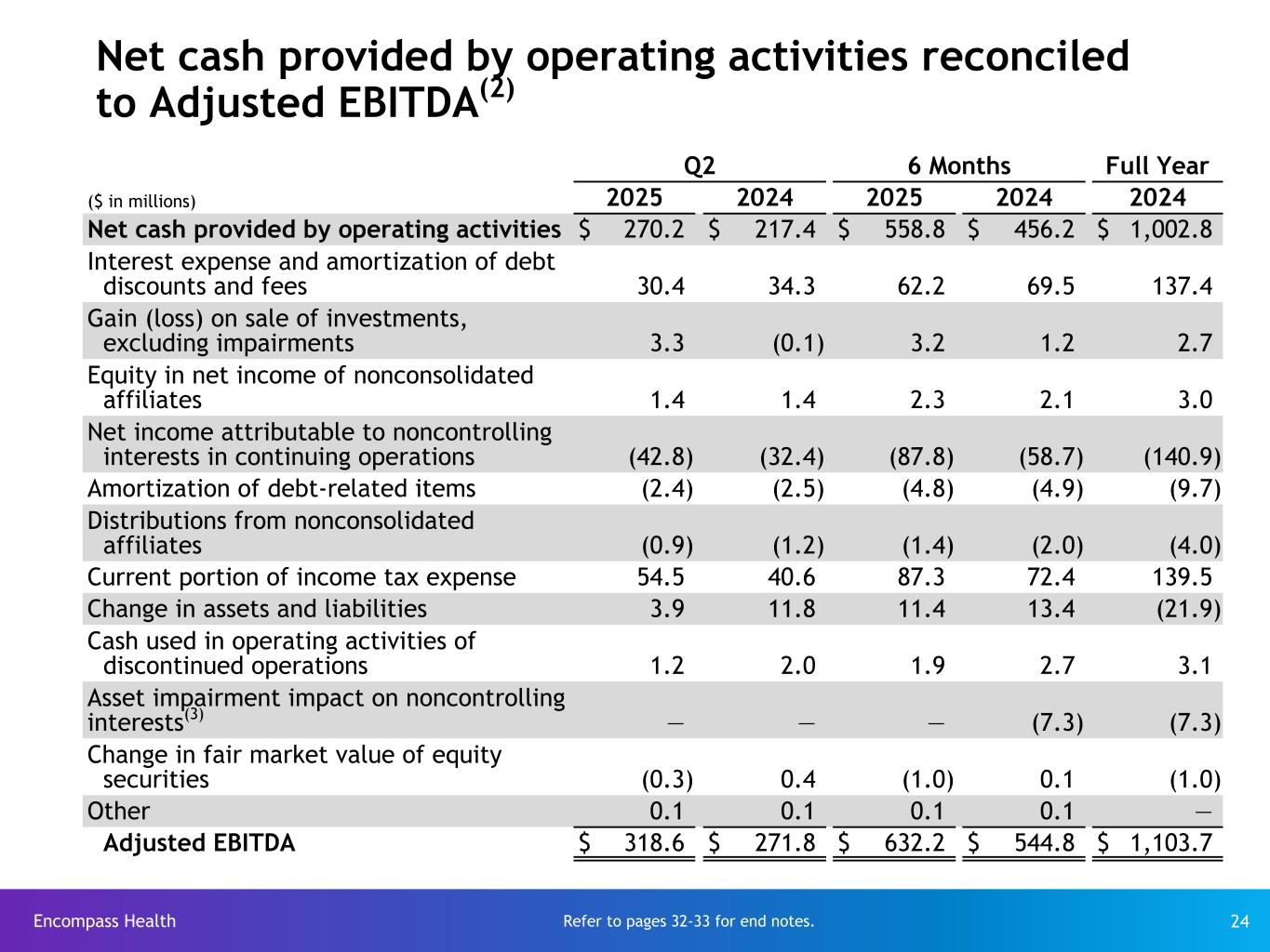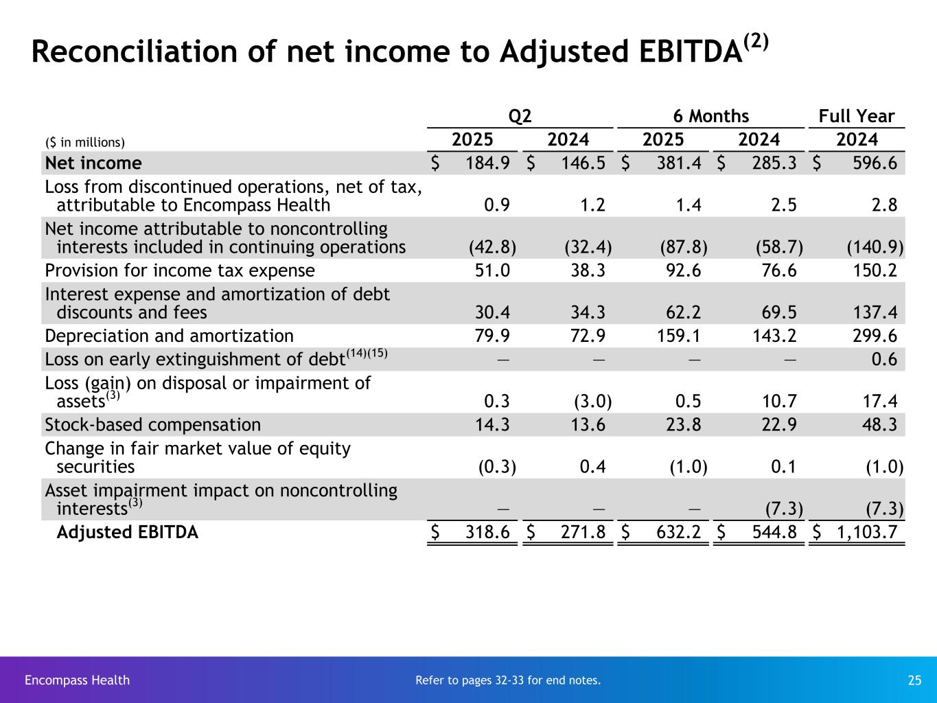 Encompass Health 24 Net cash provided by operating activities reconciled to Adjusted EBITDA(2) Q2 6 Months Full Year ($ in millions) 2025 2024 2025 2024 2024 Net cash provided by operating activities $ 270.2 $ 217.4 $ 558.8 $ 456.2 $ 1,002.8 Interest expense and amortization of debt discounts and fees 30.4 34.3 62.2 69.5 137.4 Gain (loss) on sale of investments, excluding impairments 3.3 (0.1) 3.2 1.2 2.7 Equity in net income of nonconsolidated affiliates 1.4 1.4 2.3 2.1 3.0 Net income attributable to noncontrolling interests in continuing operations (42.8) (32.4) (87.8) (58.7) (140.9) Amortization of debt-related items (2.4) (2.5) (4.8) (4.9) (9.7) Distributions from nonconsolidated affiliates (0.9) (1.2) (1.4) (2.0) (4.0) Current portion of income tax expense 54.5 40.6 87.3 72.4 139.5 Change in assets and liabilities 3.9 11.8 11.4 13.4 (21.9) Cash used in operating activities of discontinued operations 1.2 2.0 1.9 2.7 3.1 Asset impairment impact on noncontrolling interests(3) — — — (7.3) (7.3) Change in fair market value of equity securities (0.3) 0.4 (1.0) 0.1 (1.0) Other 0.1 0.1 0.1 0.1 — Adjusted EBITDA $ 318.6 $ 271.8 $ 632.2 $ 544.8 $ 1,103.7 Refer to pages 32-33 for end notes.
