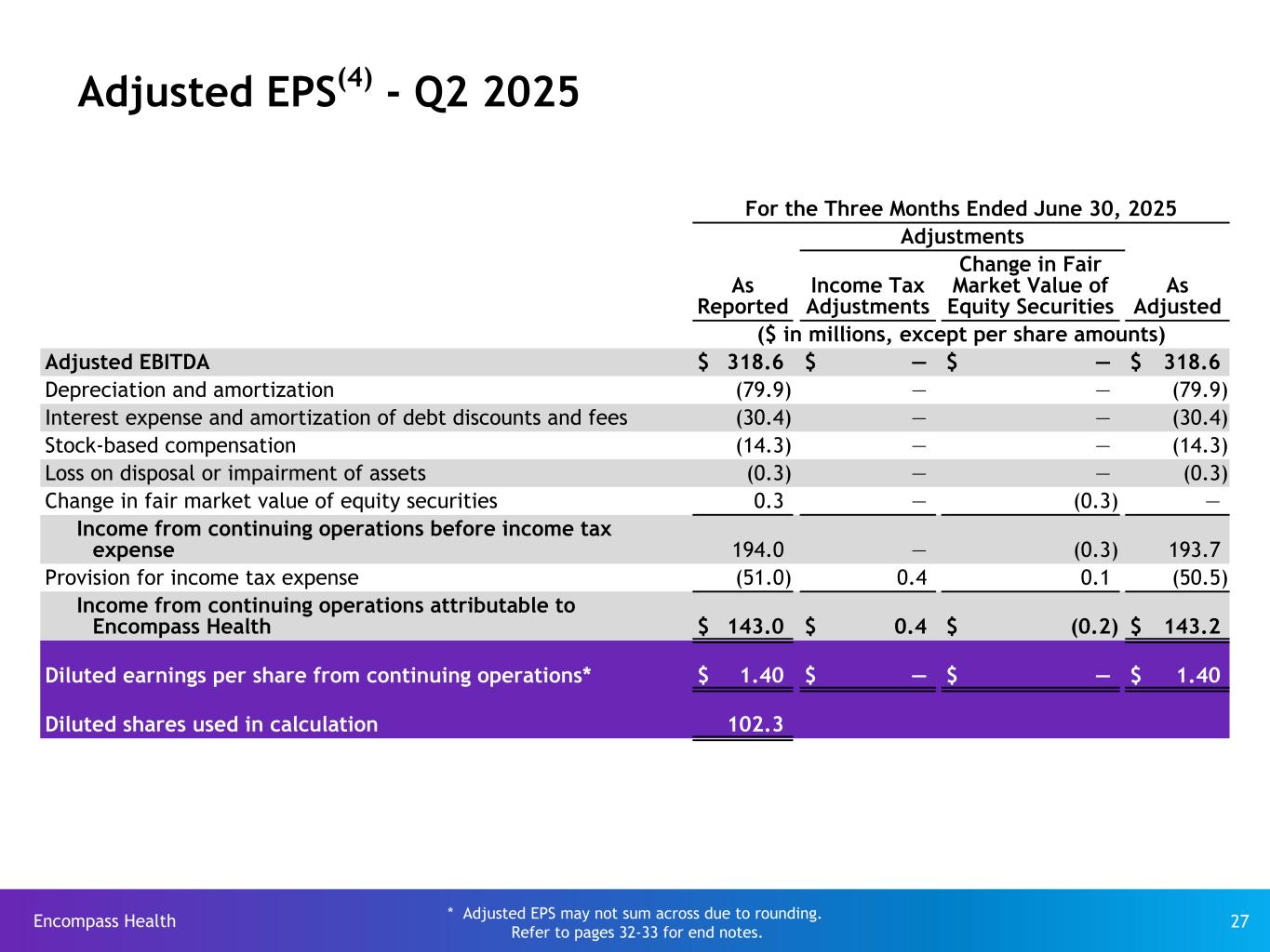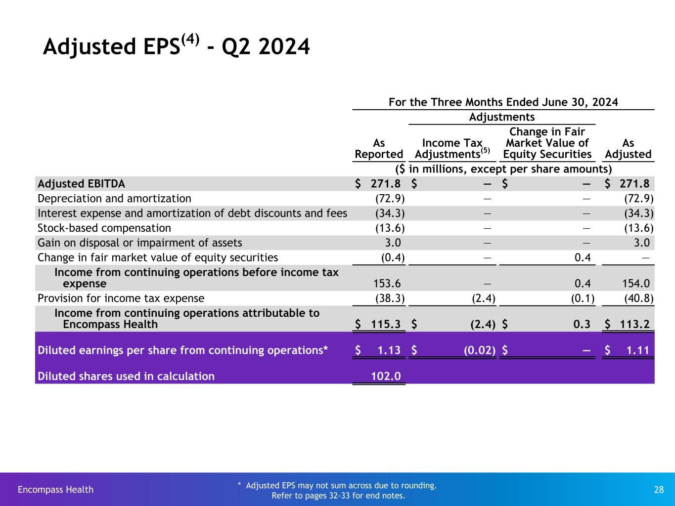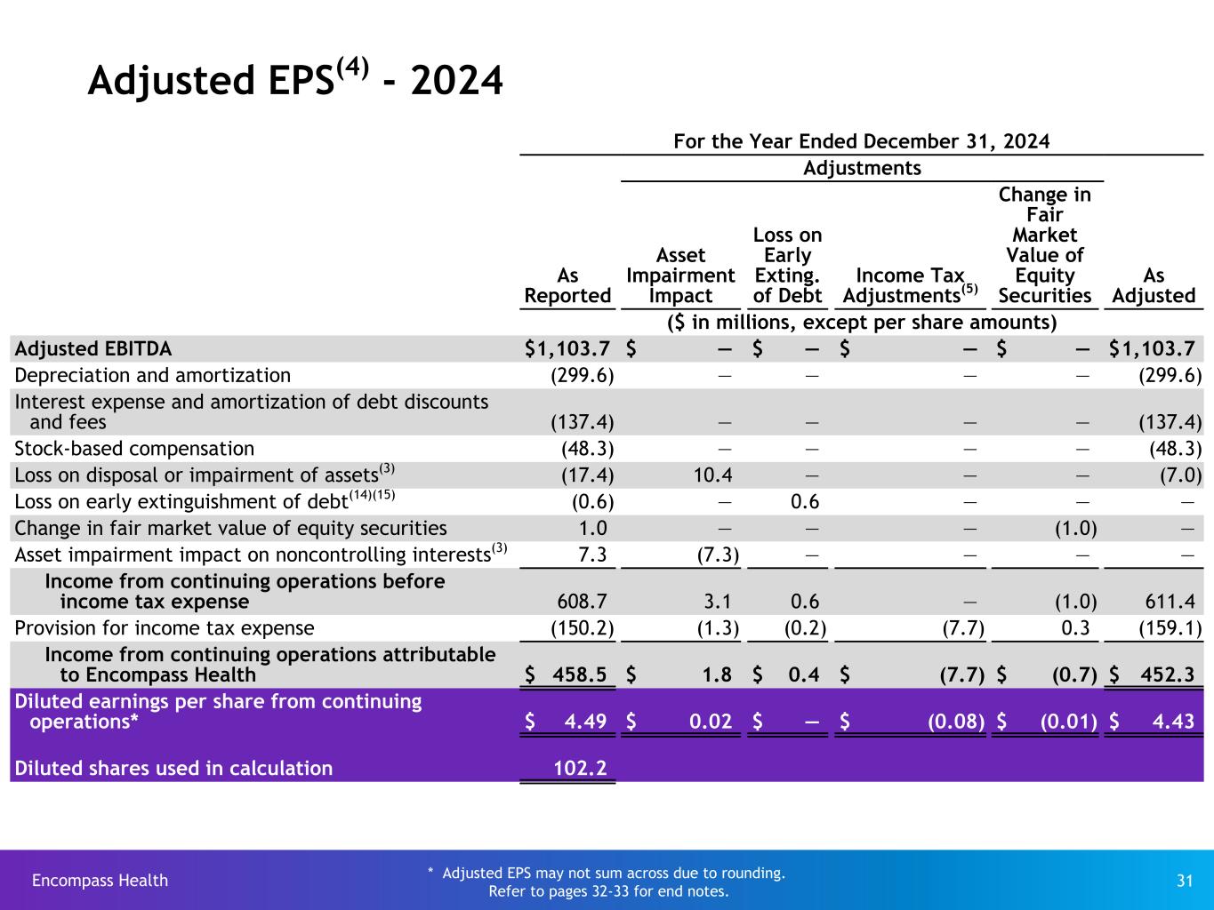 Encompass Health 31 Adjusted EPS(4) - 2024 For the Year Ended December 31, 2024 Adjustments As Reported Asset Impairment Impact Loss on Early Exting. of Debt Income Tax Adjustments(5) Change in Fair Market Value of Equity Securities As Adjusted ($ in millions, except per share amounts) Adjusted EBITDA $ 1,103.7 $ — $ — $ — $ — $ 1,103.7 Depreciation and amortization (299.6) — — — — (299.6) Interest expense and amortization of debt discounts and fees (137.4) — — — — (137.4) Stock-based compensation (48.3) — — — — (48.3) Loss on disposal or impairment of assets(3) (17.4) 10.4 — — — (7.0) Loss on early extinguishment of debt(14)(15) (0.6) — 0.6 — — — Change in fair market value of equity securities 1.0 — — — (1.0) — Asset impairment impact on noncontrolling interests(3) 7.3 (7.3) — — — — Income from continuing operations before income tax expense 608.7 3.1 0.6 — (1.0) 611.4 Provision for income tax expense (150.2) (1.3) (0.2) (7.7) 0.3 (159.1) Income from continuing operations attributable to Encompass Health $ 458.5 $ 1.8 $ 0.4 $ (7.7) $ (0.7) $ 452.3 Diluted earnings per share from continuing operations* $ 4.49 $ 0.02 $ — $ (0.08) $ (0.01) $ 4.43 Diluted shares used in calculation 102.2 * Adjusted EPS may not sum across due to rounding. Refer to pages 32-33 for end notes.