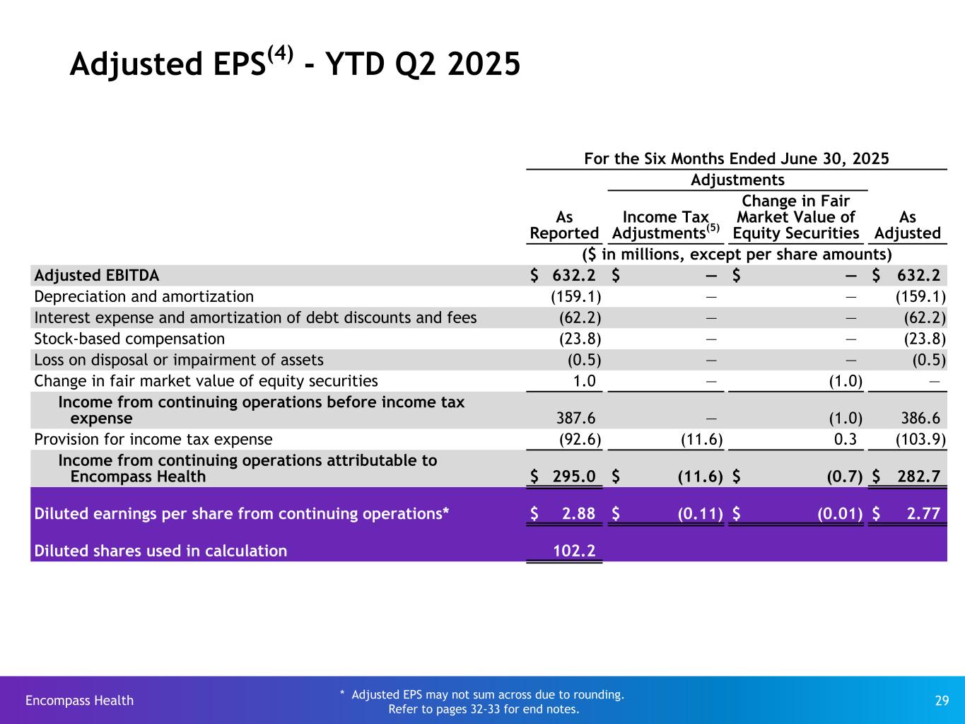 Encompass Health 28 For the Three Months Ended June 30, 2024 Adjustments As Reported Income Tax Adjustments(5) Change in Fair Market Value of Equity Securities As Adjusted ($ in millions, except per share amounts) Adjusted EBITDA $ 271.8 $ — $ — $ 271.8 Depreciation and amortization (72.9) — — (72.9) Interest expense and amortization of debt discounts and fees (34.3) — — (34.3) Stock-based compensation (13.6) — — (13.6) Gain on disposal or impairment of assets 3.0 — — 3.0 Change in fair market value of equity securities (0.4) — 0.4 — Income from continuing operations before income tax expense 153.6 — 0.4 154.0 Provision for income tax expense (38.3) (2.4) (0.1) (40.8) Income from continuing operations attributable to Encompass Health $ 115.3 $ (2.4) $ 0.3 $ 113.2 Diluted earnings per share from continuing operations* $ 1.13 $ (0.02) $ — $ 1.11 Diluted shares used in calculation 102.0 Adjusted EPS(4) - Q2 2024 * Adjusted EPS may not sum across due to rounding. Refer to pages 32-33 for end notes.