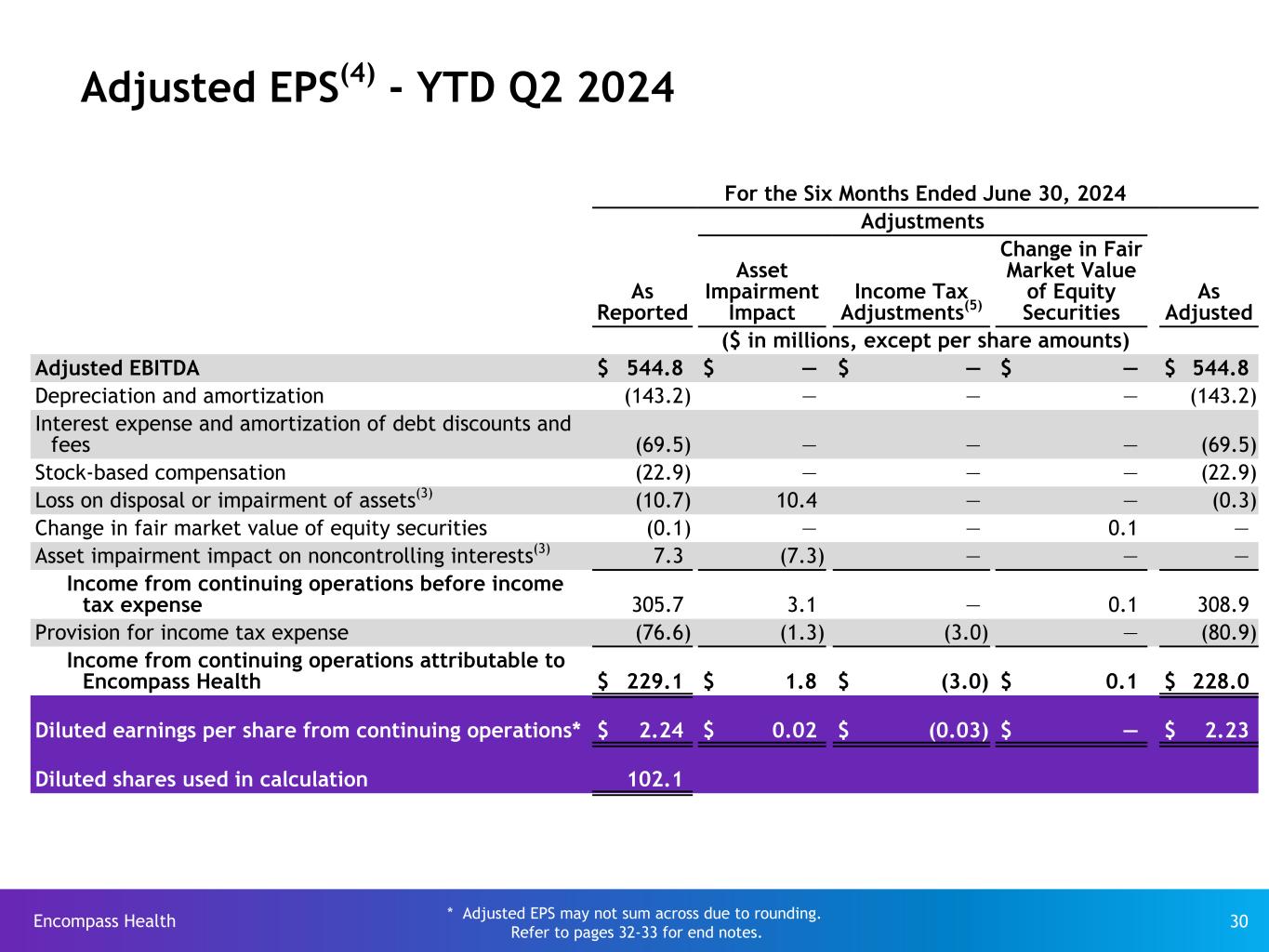 Encompass Health 29 Adjusted EPS(4) - YTD Q2 2025 For the Six Months Ended June 30, 2025 Adjustments As Reported Income Tax Adjustments(5) Change in Fair Market Value of Equity Securities As Adjusted ($ in millions, except per share amounts) Adjusted EBITDA $ 632.2 $ — $ — $ 632.2 Depreciation and amortization (159.1) — — (159.1) Interest expense and amortization of debt discounts and fees (62.2) — — (62.2) Stock-based compensation (23.8) — — (23.8) Loss on disposal or impairment of assets (0.5) — — (0.5) Change in fair market value of equity securities 1.0 — (1.0) — Income from continuing operations before income tax expense 387.6 — (1.0) 386.6 Provision for income tax expense (92.6) (11.6) 0.3 (103.9) Income from continuing operations attributable to Encompass Health $ 295.0 $ (11.6) $ (0.7) $ 282.7 Diluted earnings per share from continuing operations* $ 2.88 $ (0.11) $ (0.01) $ 2.77 Diluted shares used in calculation 102.2 * Adjusted EPS may not sum across due to rounding. Refer to pages 32-33 for end notes.