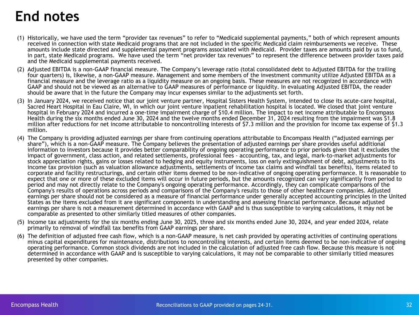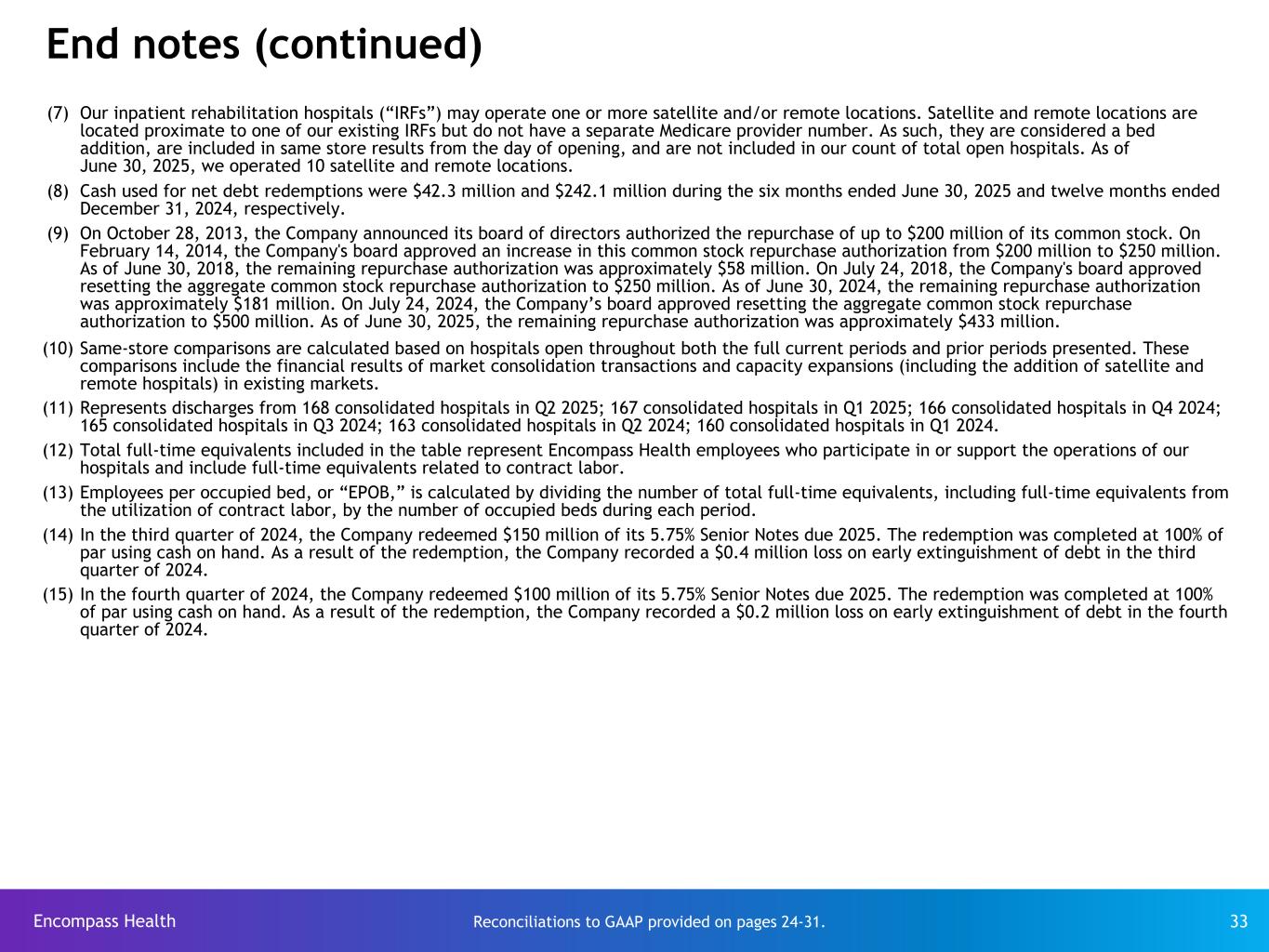 Encompass Health 32 End notes Reconciliations to GAAP provided on pages 24-31. (1) Historically, we have used the term “provider tax revenues” to refer to “Medicaid supplemental payments,” both of which represent amounts received in connection with state Medicaid programs that are not included in the specific Medicaid claim reimbursements we receive. These amounts include state directed and supplemental payment programs associated with Medicaid. Provider taxes are amounts paid by us to fund, in part, state Medicaid programs. We have used the term “net provider tax revenues” to represent the difference between provider taxes paid and the Medicaid supplemental payments received. (2) Adjusted EBITDA is a non-GAAP financial measure. The Company’s leverage ratio (total consolidated debt to Adjusted EBITDA for the trailing four quarters) is, likewise, a non-GAAP measure. Management and some members of the investment community utilize Adjusted EBITDA as a financial measure and the leverage ratio as a liquidity measure on an ongoing basis. These measures are not recognized in accordance with GAAP and should not be viewed as an alternative to GAAP measures of performance or liquidity. In evaluating Adjusted EBITDA, the reader should be aware that in the future the Company may incur expenses similar to the adjustments set forth. (3) In January 2024, we received notice that our joint venture partner, Hospital Sisters Health System, intended to close its acute-care hospital, Sacred Heart Hospital in Eau Claire, WI, in which our joint venture inpatient rehabilitation hospital is located. We closed that joint venture hospital in February 2024 and incurred a one-time impairment charge of $10.4 million. The impact to net income attributable to Encompass Health during the six months ended June 30, 2024 and the twelve months ended December 31, 2024 resulting from the impairment was $1.8 million after reductions for net income attributable to noncontrolling interests of $7.3 million and the provision for income tax expense of $1.3 million. (4) The Company is providing adjusted earnings per share from continuing operations attributable to Encompass Health (“adjusted earnings per share”), which is a non-GAAP measure. The Company believes the presentation of adjusted earnings per share provides useful additional information to investors because it provides better comparability of ongoing operating performance to prior periods given that it excludes the impact of government, class action, and related settlements, professional fees - accounting, tax, and legal, mark-to-market adjustments for stock appreciation rights, gains or losses related to hedging and equity instruments, loss on early extinguishment of debt, adjustments to its income tax provision (such as valuation allowance adjustments, settlements of income tax claims and windfall tax benefits), items related to corporate and facility restructurings, and certain other items deemed to be non-indicative of ongoing operating performance. It is reasonable to expect that one or more of these excluded items will occur in future periods, but the amounts recognized can vary significantly from period to period and may not directly relate to the Company's ongoing operating performance. Accordingly, they can complicate comparisons of the Company's results of operations across periods and comparisons of the Company's results to those of other healthcare companies. Adjusted earnings per share should not be considered as a measure of financial performance under generally accepted accounting principles in the United States as the items excluded from it are significant components in understanding and assessing financial performance. Because adjusted earnings per share is not a measurement determined in accordance with GAAP and is thus susceptible to varying calculations, it may not be comparable as presented to other similarly titled measures of other companies. (5) Income tax adjustments for the six months ending June 30, 2025, three and six months ended June 30, 2024, and year ended 2024, relate primarily to removal of windfall tax benefits from GAAP earnings per share. (6) The definition of adjusted free cash flow, which is a non-GAAP measure, is net cash provided by operating activities of continuing operations minus capital expenditures for maintenance, distributions to noncontrolling interests, and certain items deemed to be non-indicative of ongoing operating performance. Common stock dividends are not included in the calculation of adjusted free cash flow. Because this measure is not determined in accordance with GAAP and is susceptible to varying calculations, it may not be comparable to other similarly titled measures presented by other companies.
