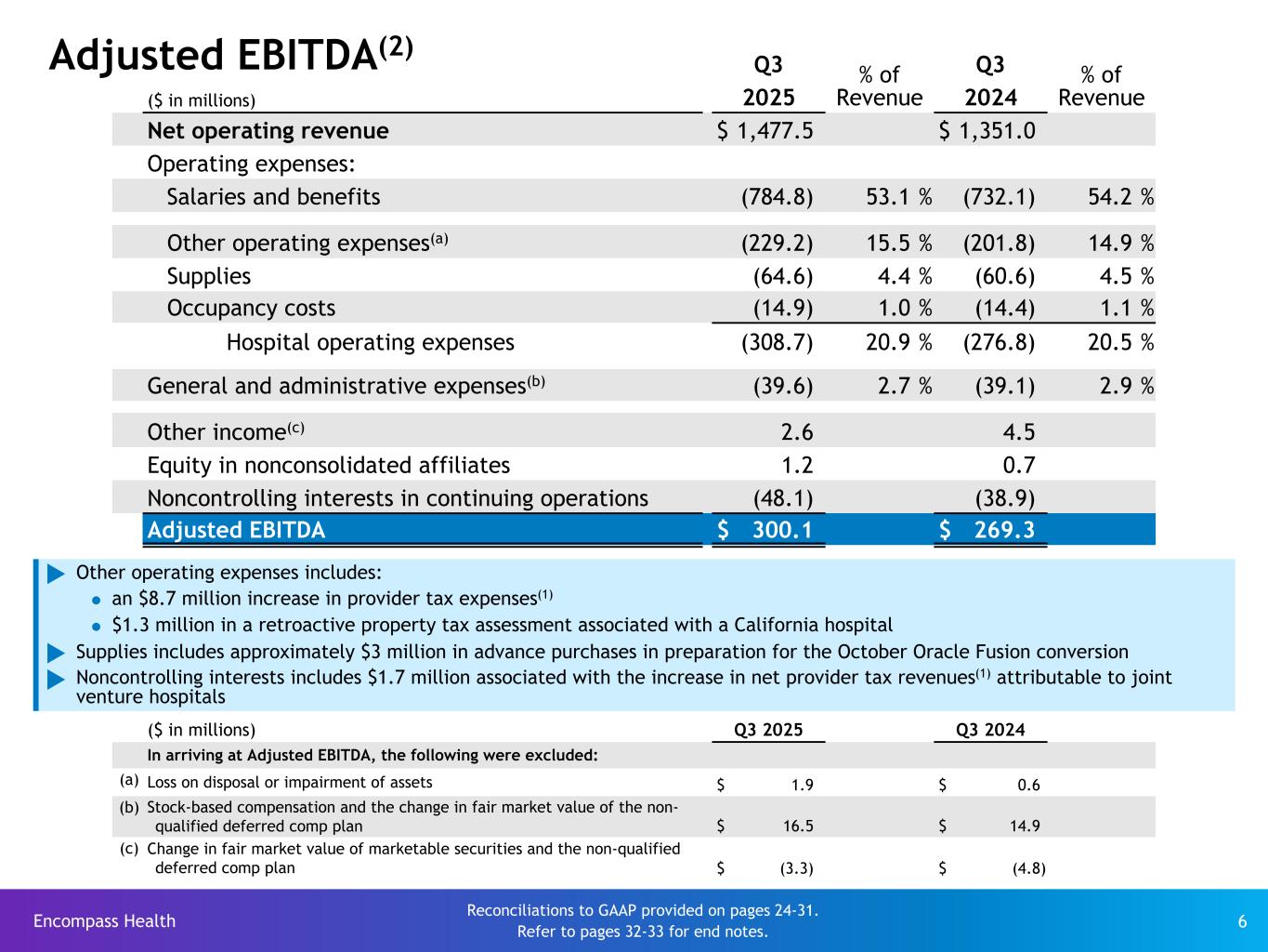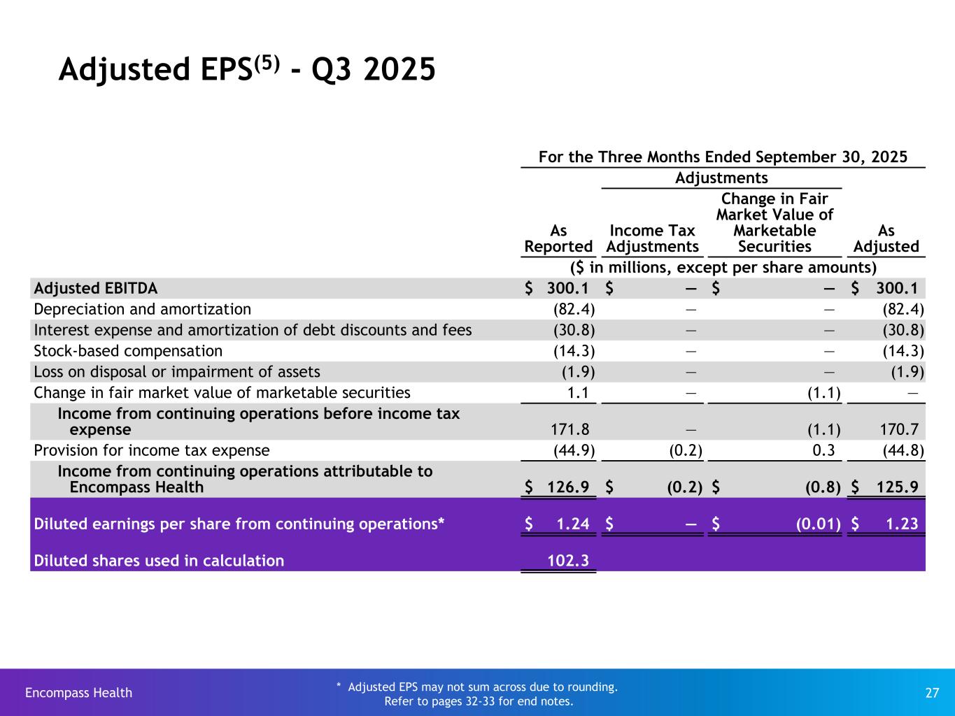 Encompass Health 25 Reconciliation of net income to Adjusted EBITDA(2) Q3 9 Months Full Year ($ in millions) 2025 2024 2025 2024 2024 Net income $ 174.6 $ 147.1 $ 556.0 $ 432.4 $ 596.6 Loss from discontinued operations, net of tax, attributable to Encompass Health 0.4 0.7 1.8 3.2 2.8 Net income attributable to noncontrolling interests included in continuing operations (48.1) (38.9) (135.9) (97.6) (140.9) Provision for income tax expense 44.9 36.0 137.5 112.6 150.2 Interest expense and amortization of debt discounts and fees 30.8 34.9 93.0 104.4 137.4 Depreciation and amortization 82.4 78.4 241.5 221.6 299.6 Loss on early extinguishment of debt(4)(15) — 0.4 — 0.4 0.6 Loss on disposal or impairment of assets(3) 1.9 0.6 2.4 11.3 17.4 Stock-based compensation 14.3 12.9 38.1 35.8 48.3 Asset impairment impact on noncontrolling interests(3) — — — (7.3) (7.3) Change in fair market value of marketable securities (1.1) (2.8) (2.1) (2.7) (1.0) Adjusted EBITDA $ 300.1 $ 269.3 $ 932.3 $ 814.1 $ 1,103.7 Refer to pages 32-33 for end notes.